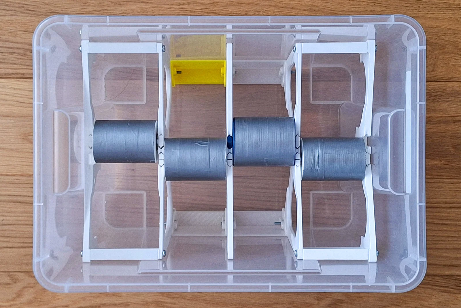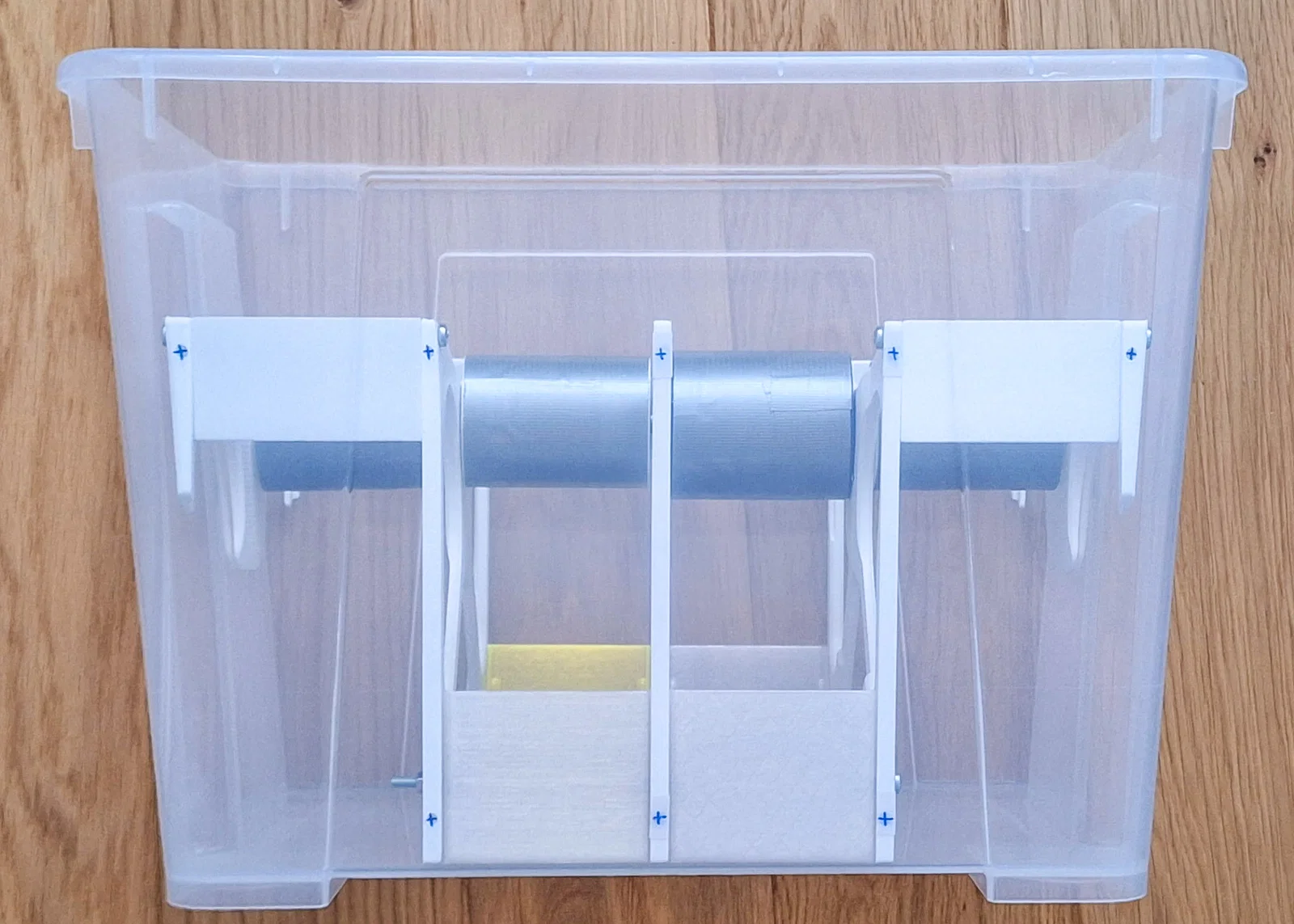 Tôi thích dùng trục quay hơn vì kéo nhựa nhẹ nhàng hơn nhiều. Các giải pháp cho hộp SAMLA hiện nay chỉ có một trục dài chung, muốn thay 1 cuộn nhựa ở giữa rất bất tiện. Giải pháp của tôi là trục trung tâm riêng cho từng cuộn, cho phép thay thế từng cuộn một cách linh hoạt. Để nhét vừa 4 cuộn vào thùng 22L, tôi đã tạo ra hệ thống xếp chồng zíc-zắc.
