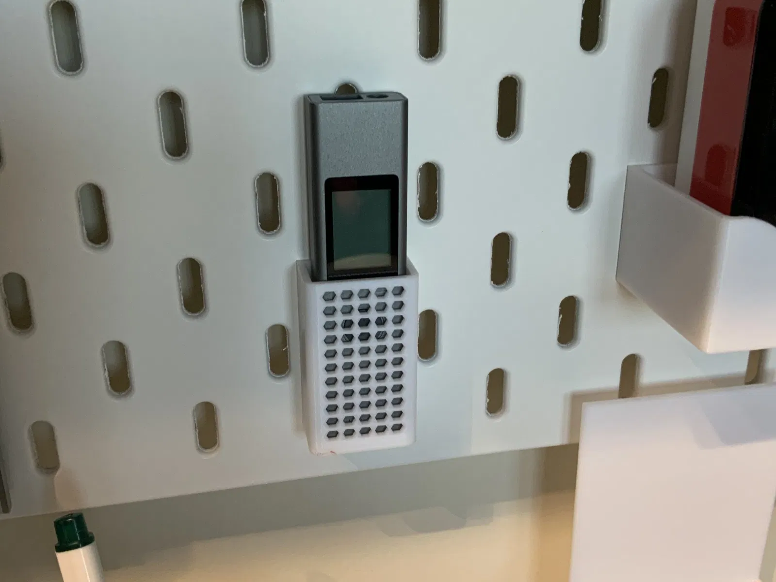 Đây là người giữ IKEA Skadis cho một thiết bị đo laser mini.