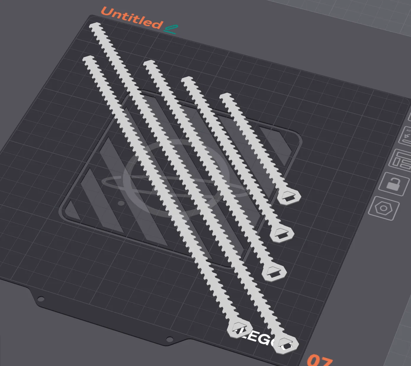 Dây rút (zip tie) tái sử dụng theo hệ mét, có nhiều kích cỡ từ 10–30cm (bước 5cm), đặt chéo vừa khay 225x225. Có kèm bảng ước tính lượng filament theo từng size, in PLA dùng ổn.