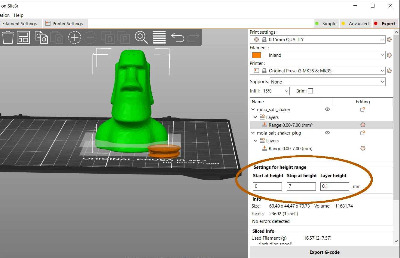 Với 7mm đầu tiên, dùng layer height 0.1mm (trong slicer bật Advanced/Expert mode): Thêm "Height range Modifier" (nhấp chuột phải lên model hoặc tên), rồi trong ô Height ranges đặt start 0, stop 7, layer height 0.1 (xem hình chụp màn hình)