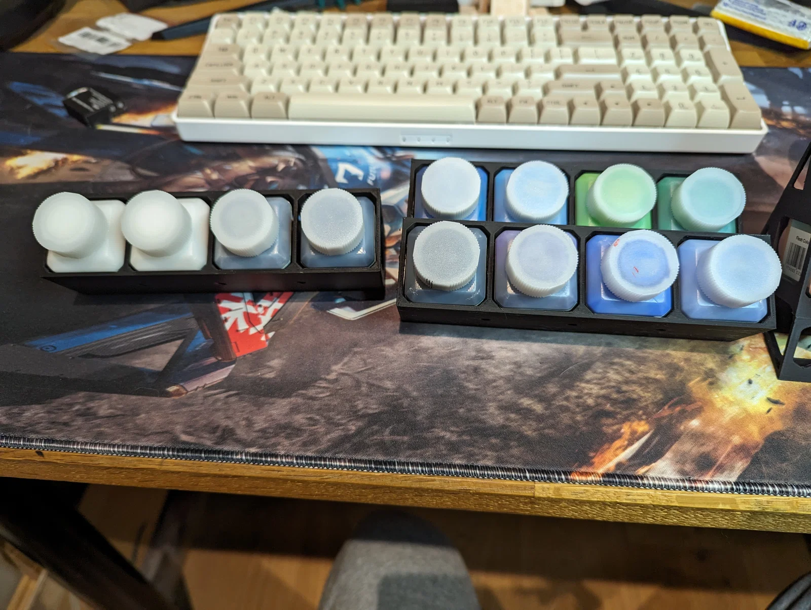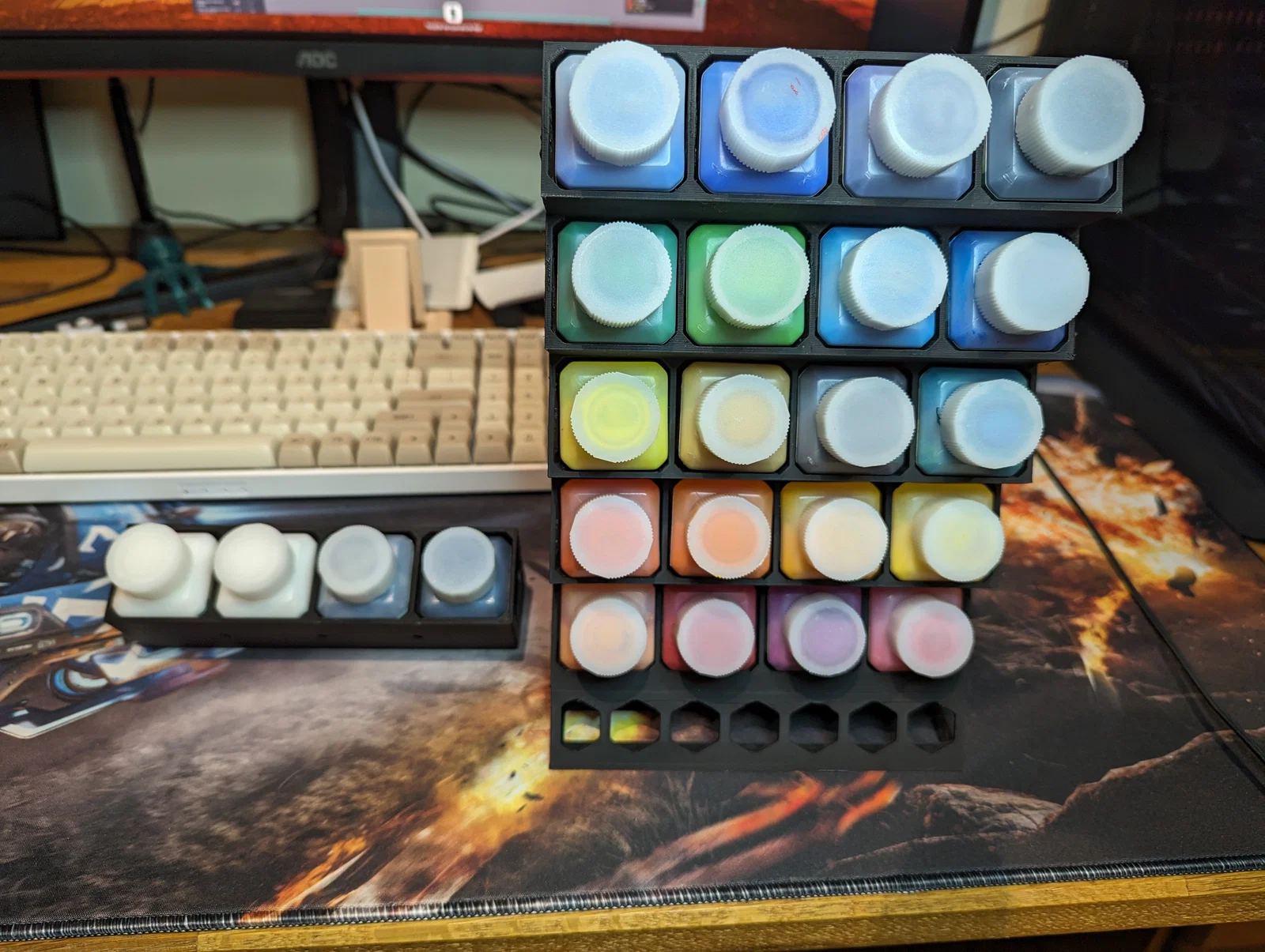 Đây là một cái kệ để đựng chai sơn airbrush Timbertech 30ml, hoặc bất kỳ chai sơn vuông kích thước 35x35mm. Kệ chính chứa được 12 chai và bạn có thể gắn thêm các khay ở phía trên để tăng số lượng. Có 2 phần bổ sung: +8 và +4. Kệ chính có thể in không cần supports.