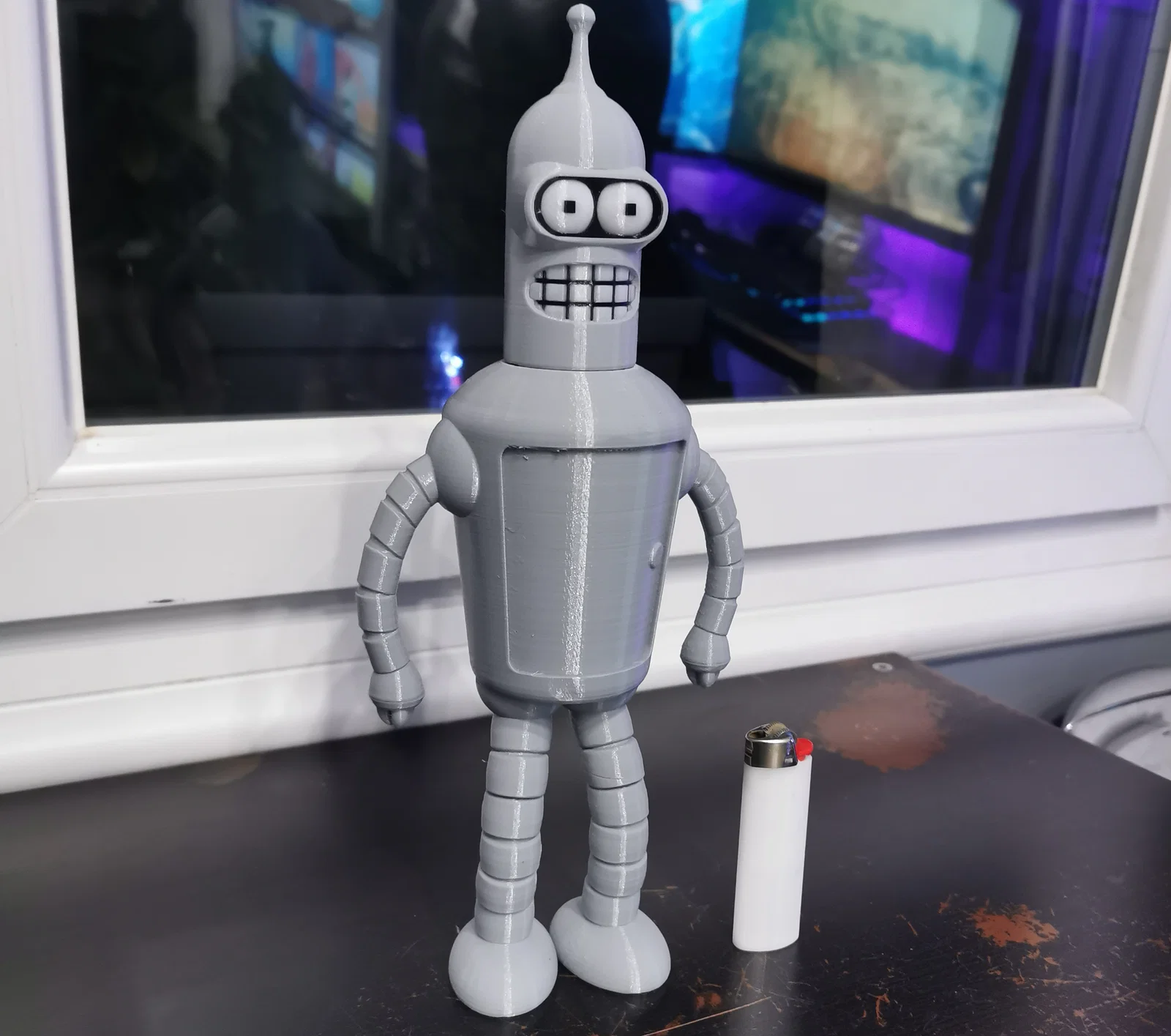 Mô hình Bender in nhiều màu, thiết kế để in không cần support. Tạo bằng Tinkercad, có link để chỉnh sửa online. Gợi ý in: Prusa i3 MK3 MMU2, layer 0,2 mm, infill 20%, PETG xám/đen/trắng.