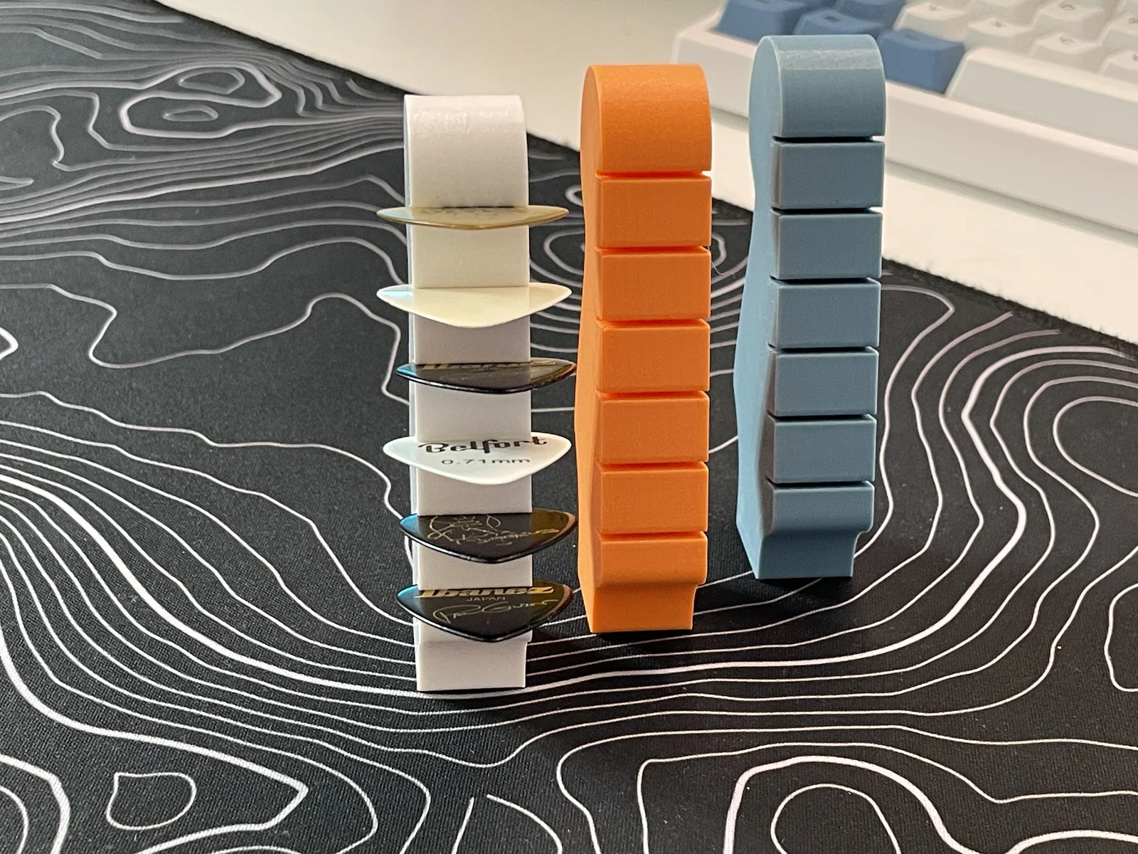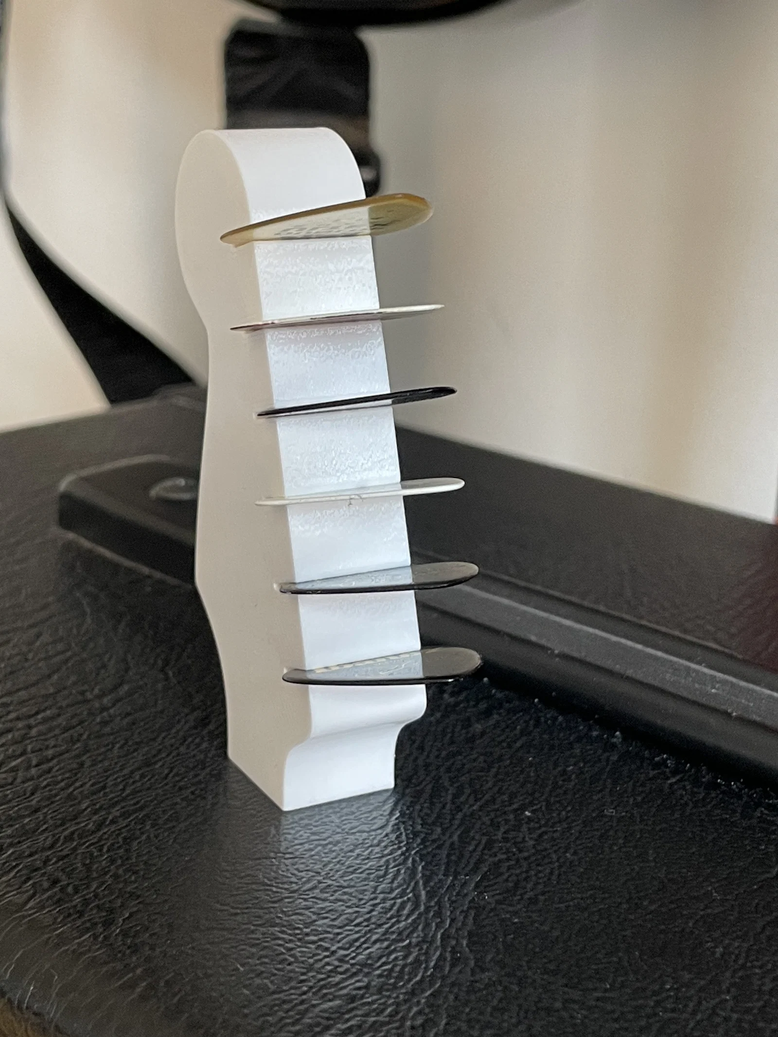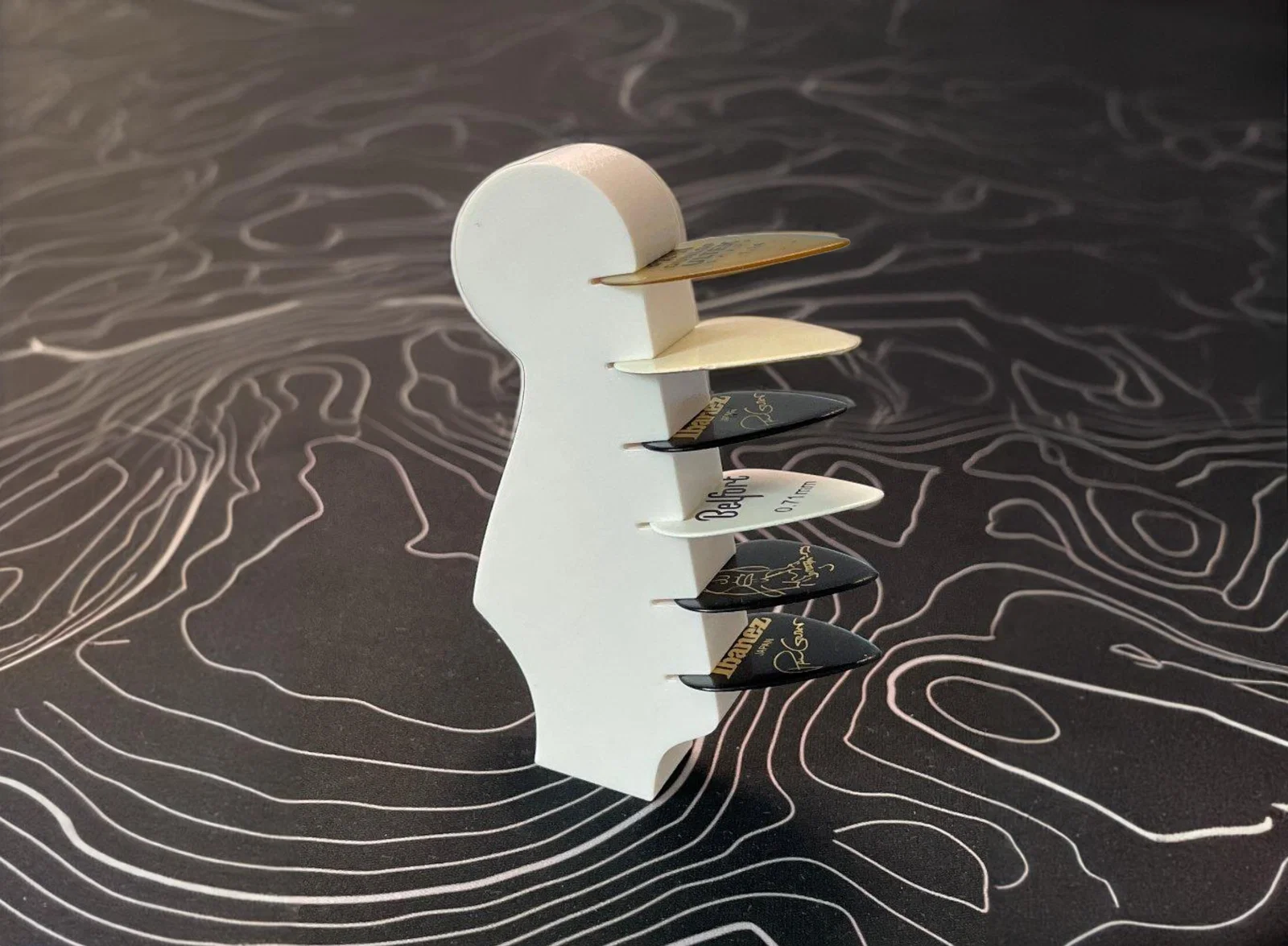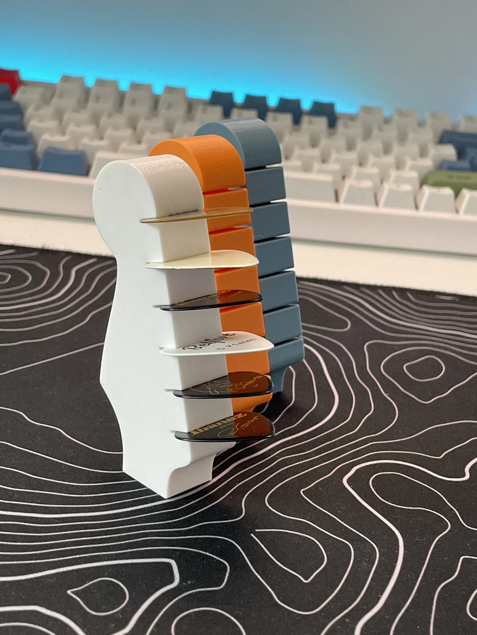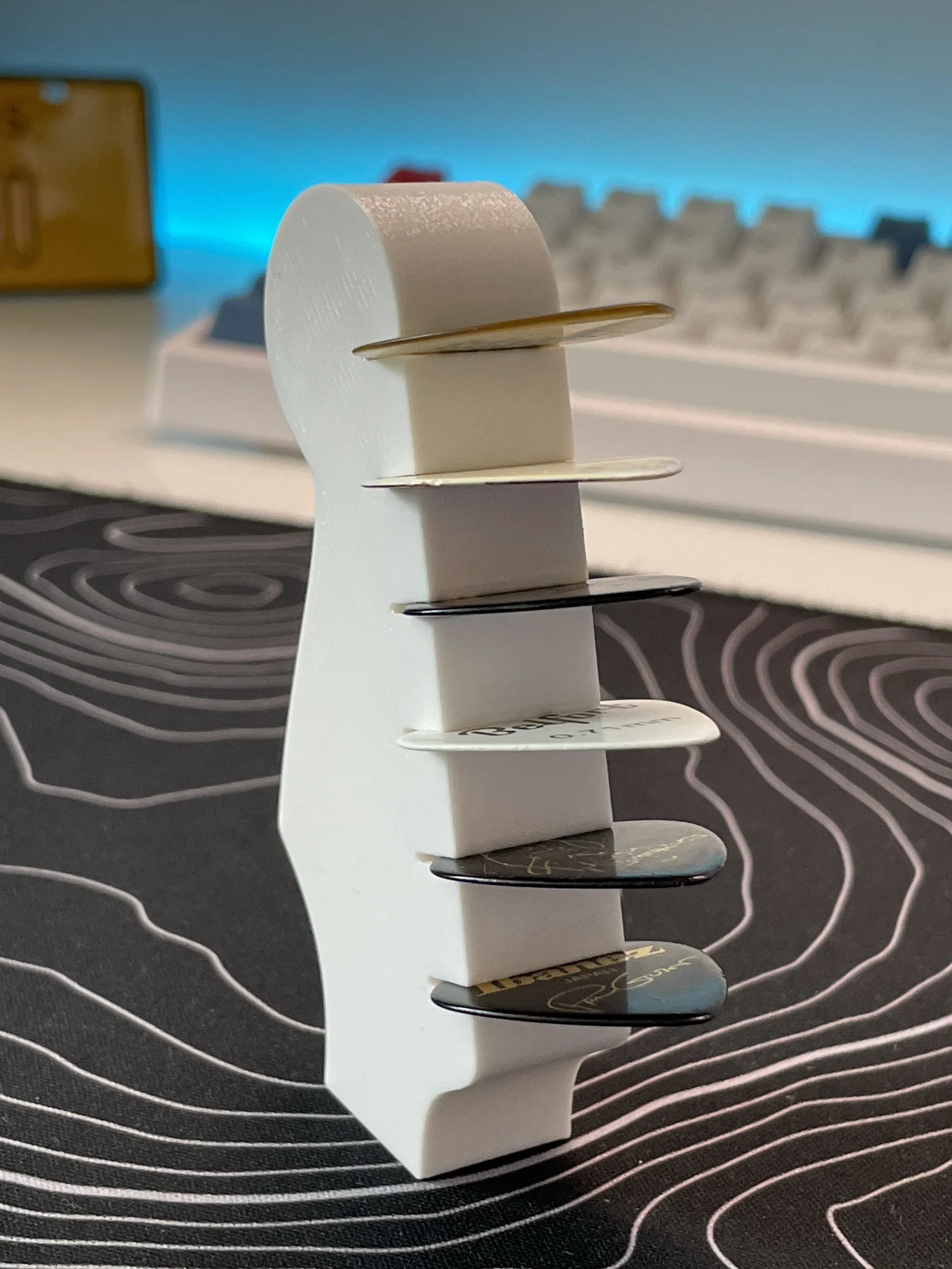 Giá đựng pick đàn guitar nhỏ gọn, thiết kế hình đầu cần đàn. Dễ in, có thể in với nhiều layer height khác nhau. Lưu ý một số loại pick có thể hơi chật khi gắn vào.