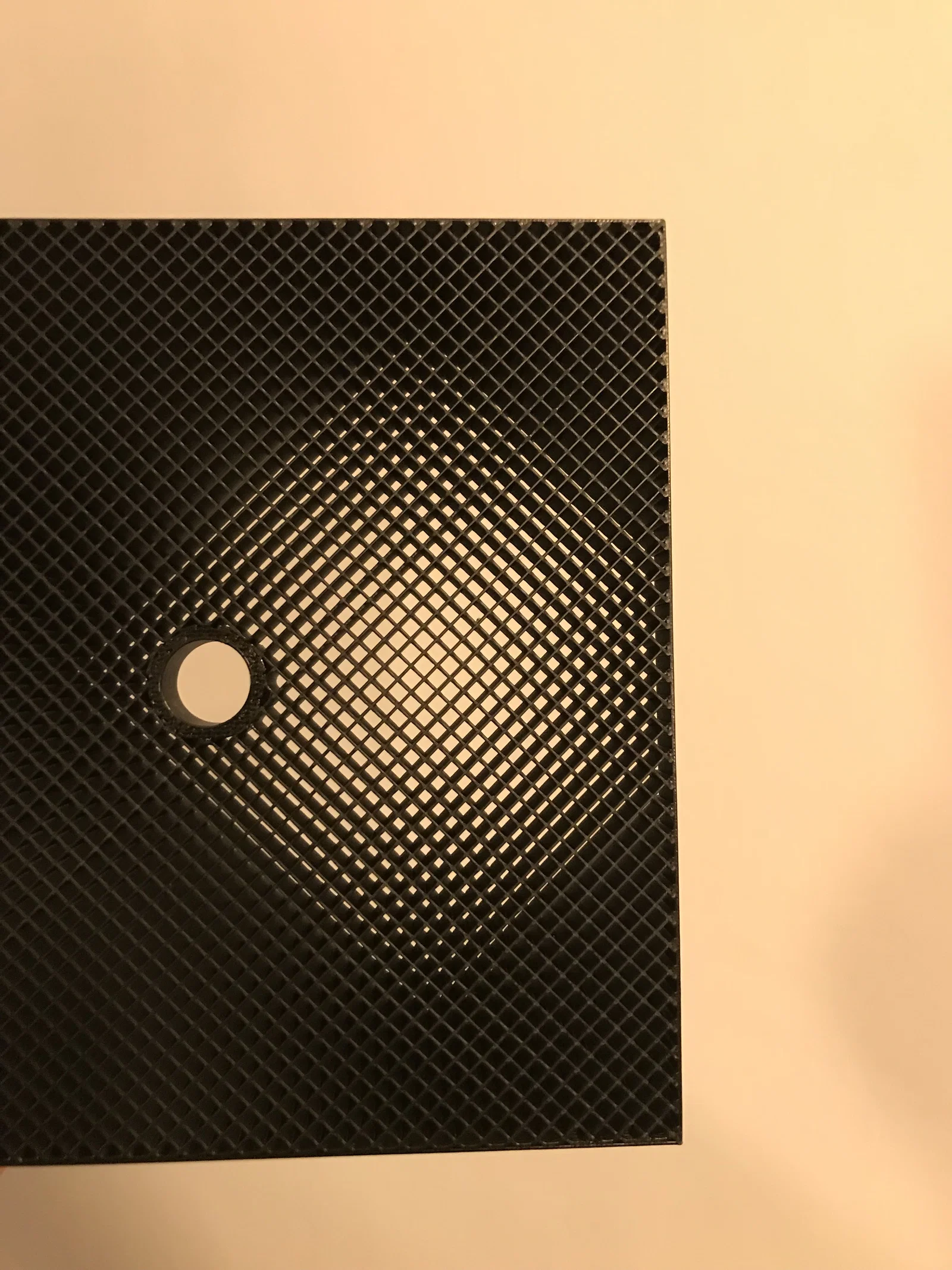 - directional grid lens - Trong Slicer đặt không có top và bottom layers, chỉ để infill. Mẫu minh hoạ dùng grid infill 30% để ra hoạ tiết mịn