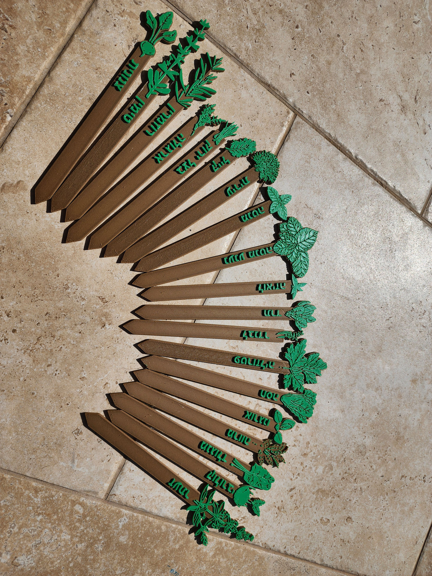 Bộ nhãn cây tùy biến cho vườn rau/rau thơm, mỗi nhãn có hình theo đúng loại cây. File không có sẵn chữ để bạn tự thêm text trong slicer theo ngôn ngữ của mình. Có thể in nhiều màu bằng cách đổi filament ở layer chữ, không cần AMS.
