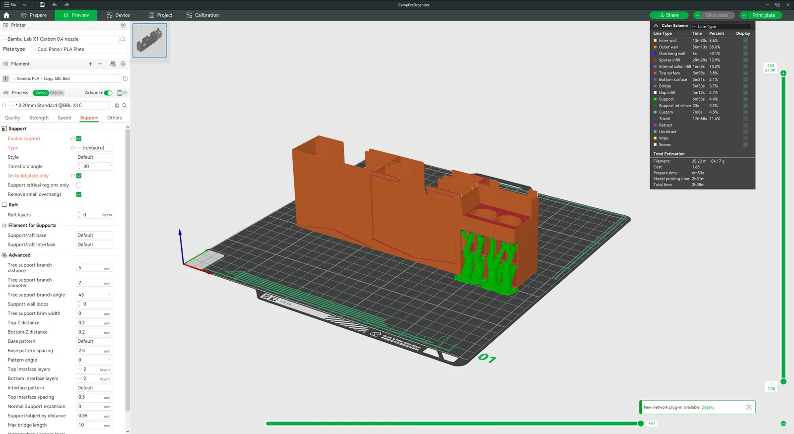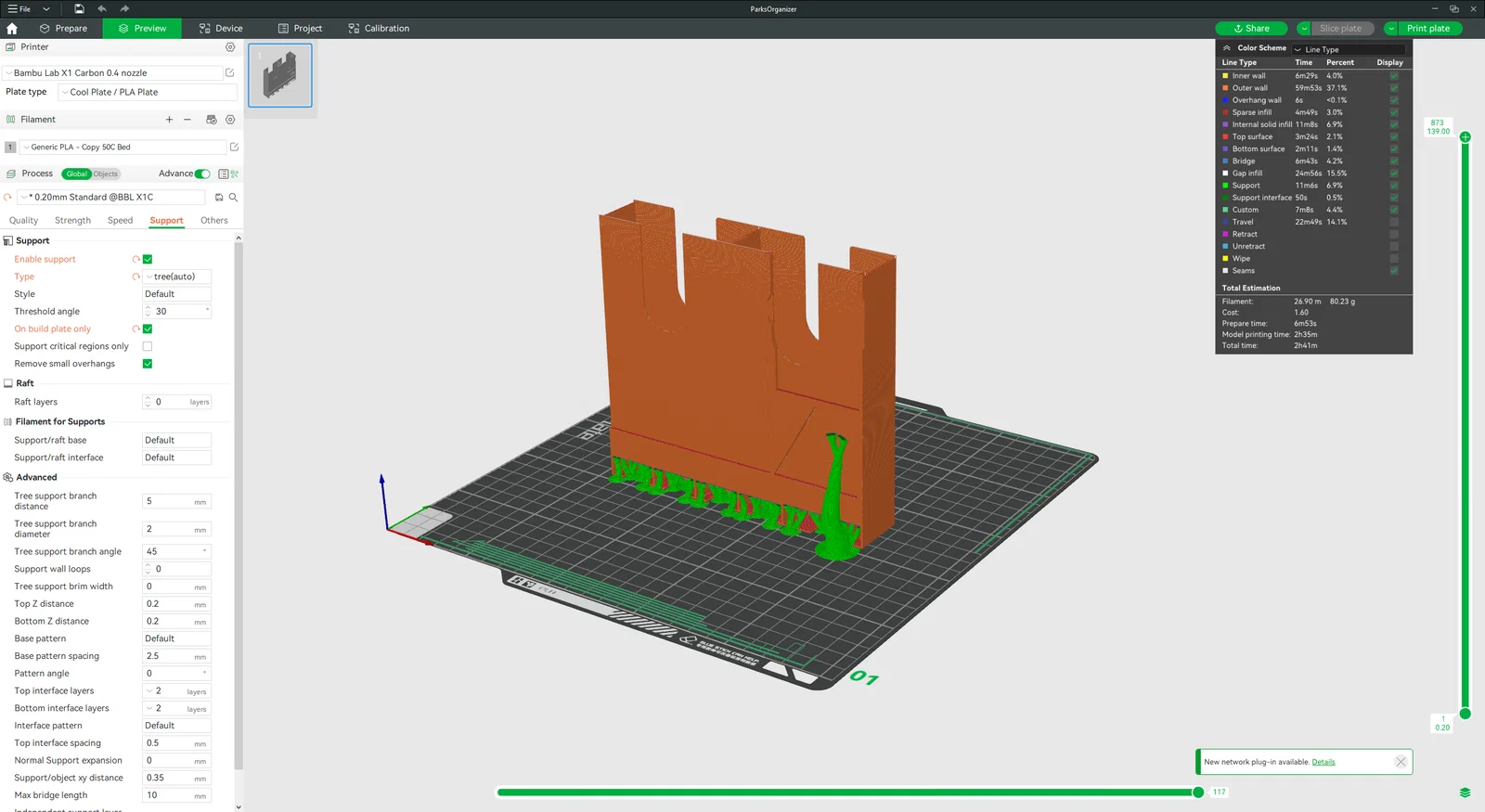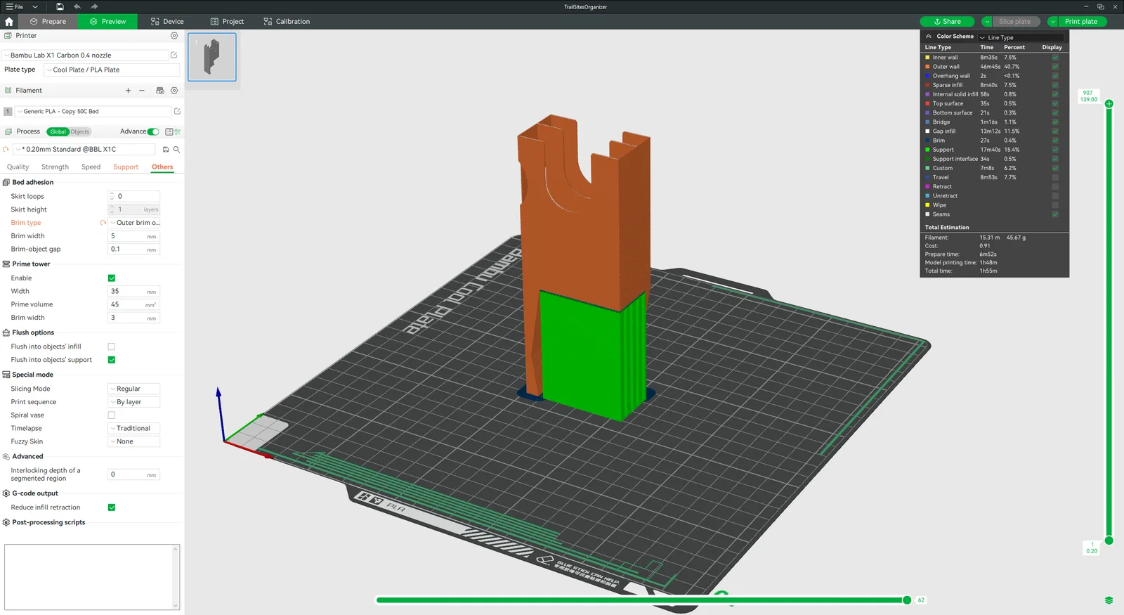 Vì không gian rất giới hạn, organizer này có nhiều vách mỏng. Mình gợi ý dùng Arachne wall generation nếu slicer của bạn có hỗ trợ. Hướng đặt để in (orientation) được gợi ý trong hình. Trail Sites Organizer bắt buộc phải dùng supports. Supports khuyến nghị cho Parks và Campfire Organizers; vẫn có thể in không supports nếu máy của bạn bridge tốt, nhưng mình thích yên tâm hơn khi có supports.