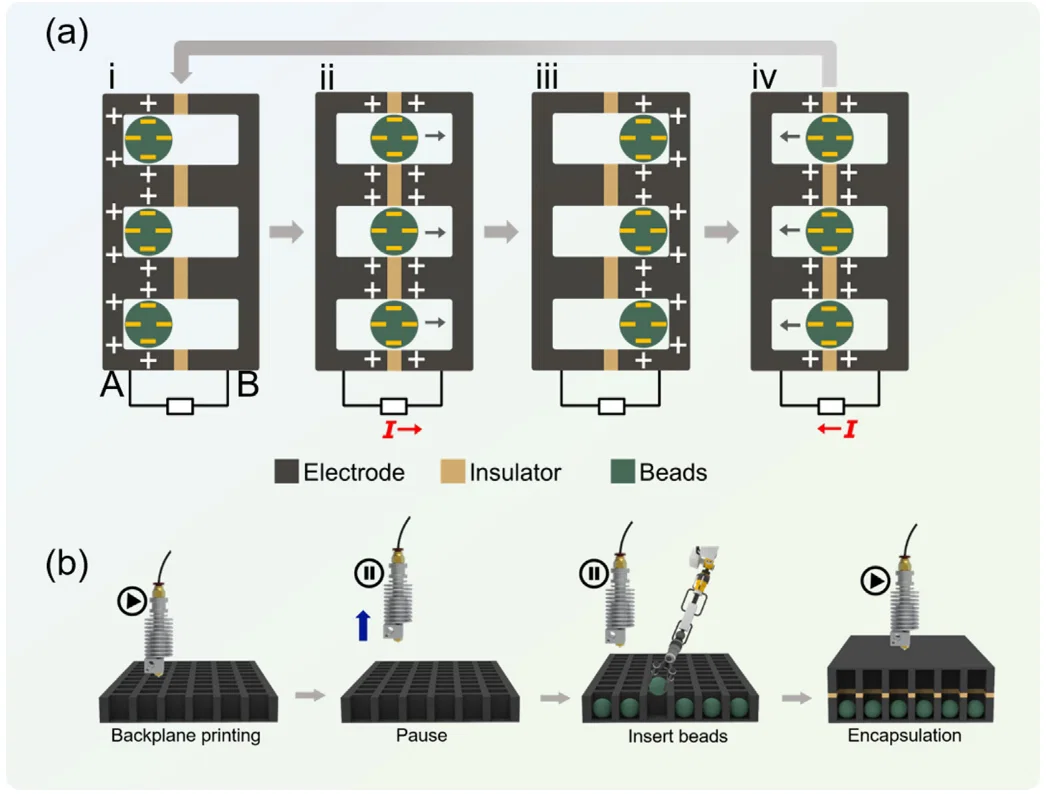Triboelectric nanogenerator (TENG) là một dạng máy phát điện mới cho “green energy”. Trong nghiên cứu của tụi mình, nhóm đã phát triển một hướng tiếp cận in 3D kiểu “pause-and-insert” và “print-in-place” mới, dùng các máy fused deposition modeling (FDM) phổ biến cùng với filament conductive (làm điện cực) và filament không dẫn điện (làm vỏ và phần đỡ) để tạo ra máy phát triboelectric nanogenerator microbeads dạng đóng kín (MB-TENG).