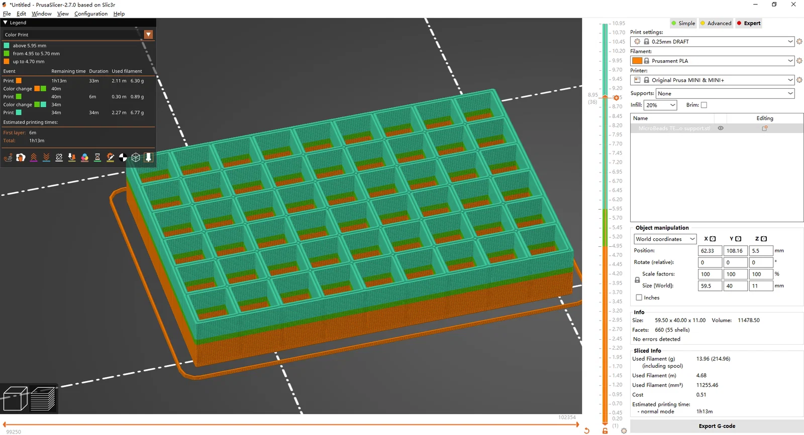 File cài đặt in và g-code của Prusa Mini kèm bước đổi vật liệu đã được đính kèm. Bạn bắt đầu bằng vật liệu conductive, đổi sang PLA thường ở khoảng 5 mm; khi gần xong (tầm 6 mm), trong lúc đổi vật liệu thì tự tay bỏ các hạt (beads) vào, rồi đổi lại sang vật liệu conductive tại mốc 6 mm và in hoàn tất. Một bộ 54 beads mất 1 giờ 13 phút.