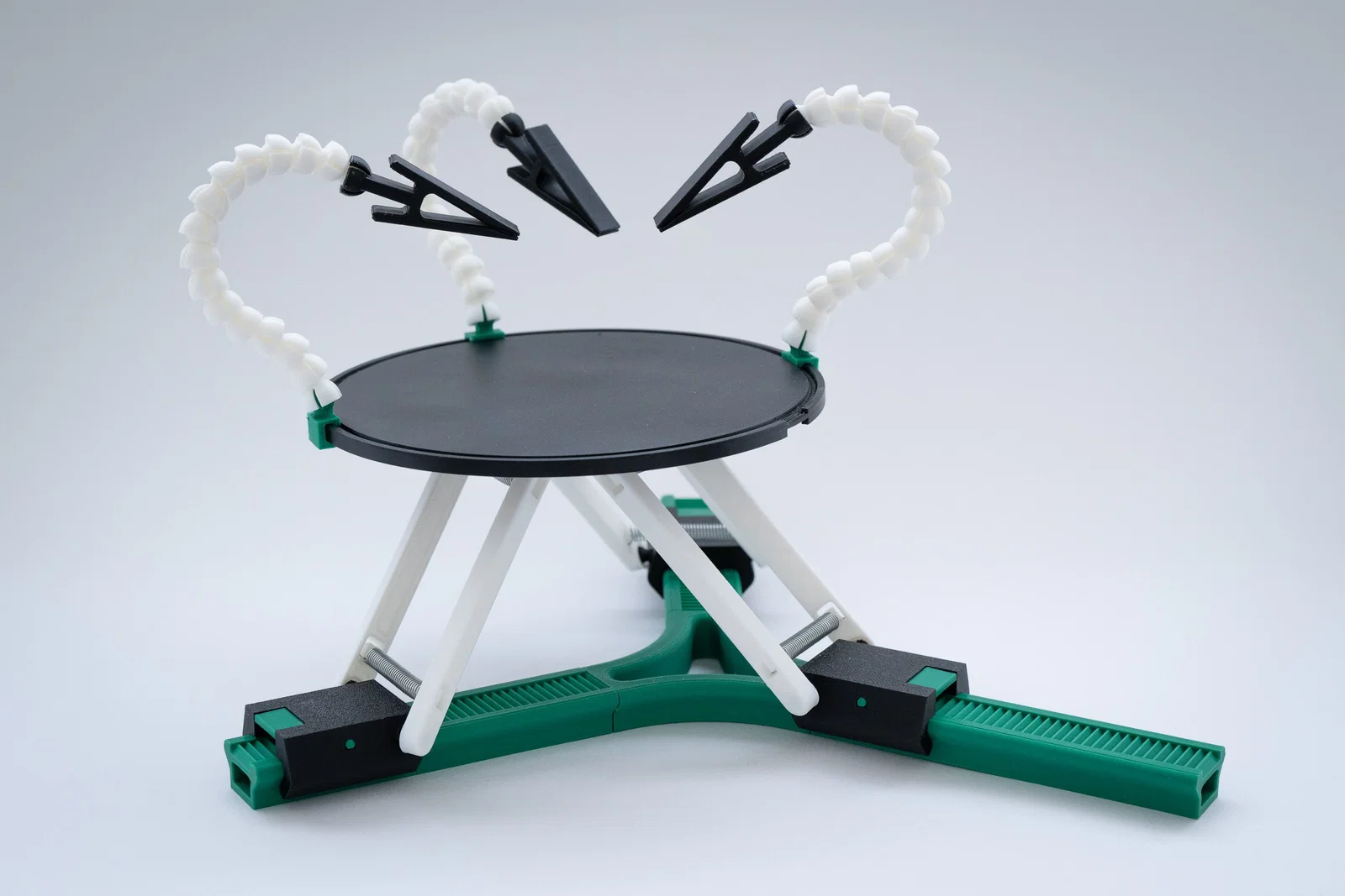 6. Giờ dùng các arms ở bước 5 để gắn mặt bàn (table) vào phần còn lại. Trượt flex arm holder lên mặt bàn và gắn bao nhiêu flex arms tùy bạn muốn, sau đó gắn thêm clamp.
