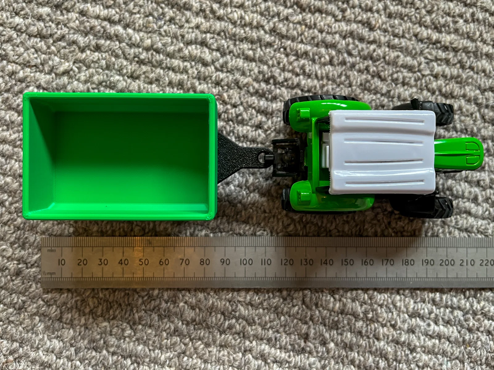 Con trai mình thắc mắc sao Toy Tractor không có rơ-moóc, tìm không ra nên mình tự thiết kế và in 3D một trailer nhỏ cho bé. Kích thước 100×50×50mm, tow loop 5mm; in với nozzle 0.4mm, layer 0.20mm.