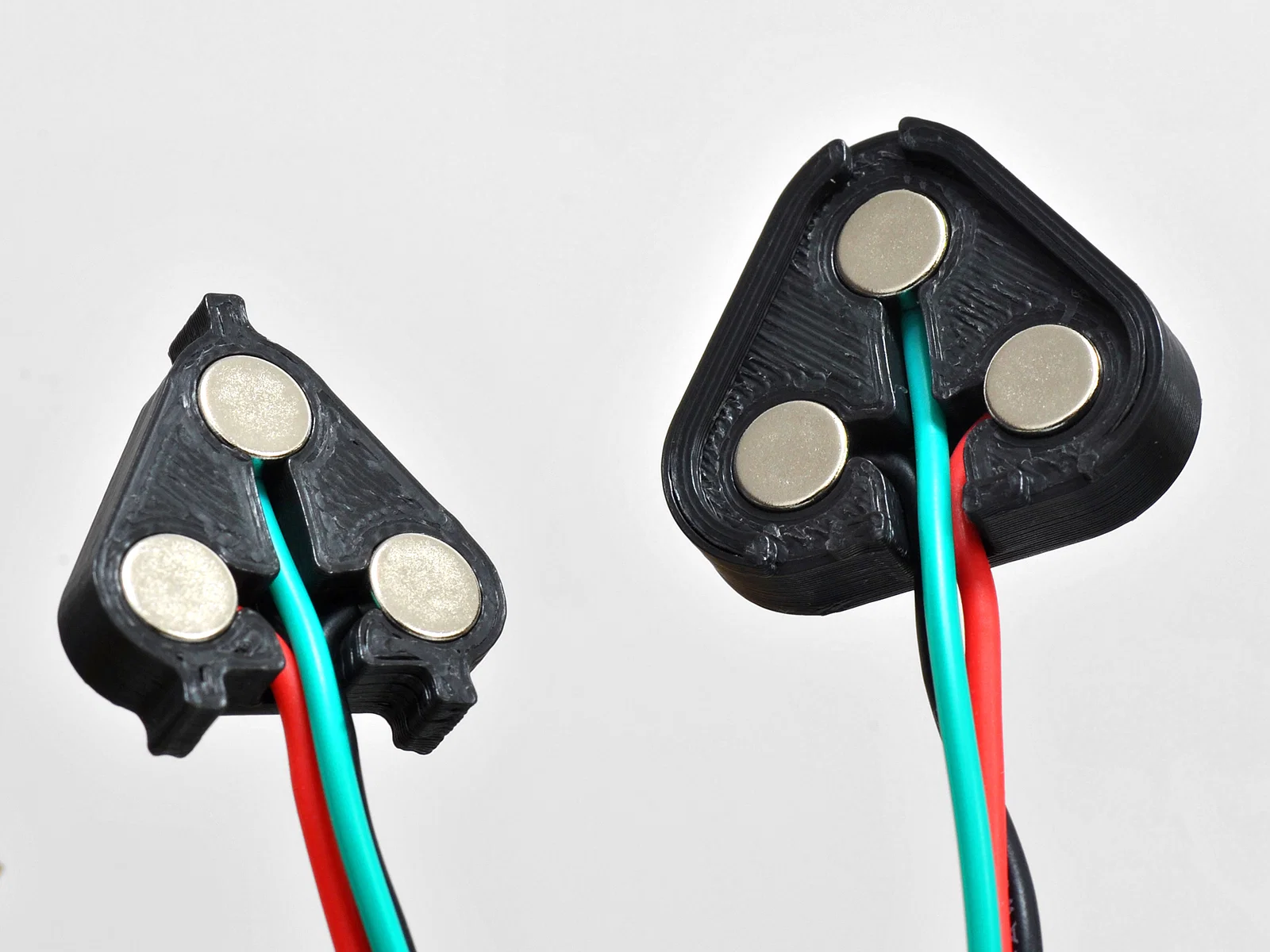Nhét nam châm vào connector, bẻ dây đi theo các rãnh hướng dẫn. Thường sẽ là kiểu press-fit, nhưng nếu không (do filament, sai số, v.v.), bạn nhỏ một vòng keo 502 quanh mép, ngay chỗ nam châm tì vào connector. Nếu bạn dùng nam châm to hoặc lực mạnh, rất nên dùng keo 502.