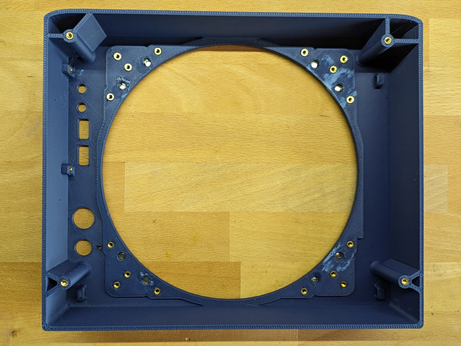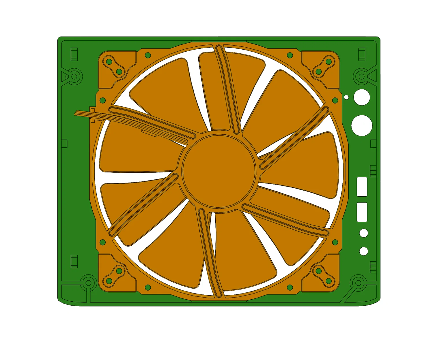 - Quạt được bắt ở mặt sau của panel bằng heat-set inserts.