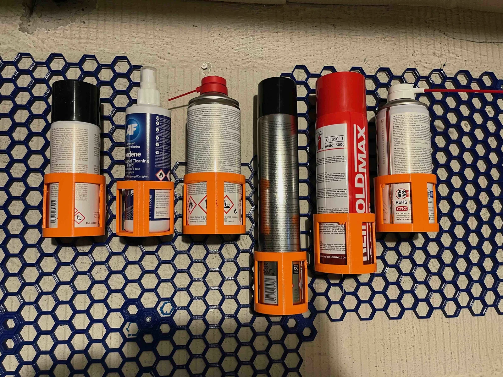 Phụ kiện gắn cho Honeycomb Storage Wall để giữ chai xịt và chai lọ. Có sẵn STL cho vài kích thước phổ biến; cần kích thước khác thì chỉnh bằng OpenSCAD. Cắm trực tiếp vào tường tổ ong, in đúng hướng và dùng supports.