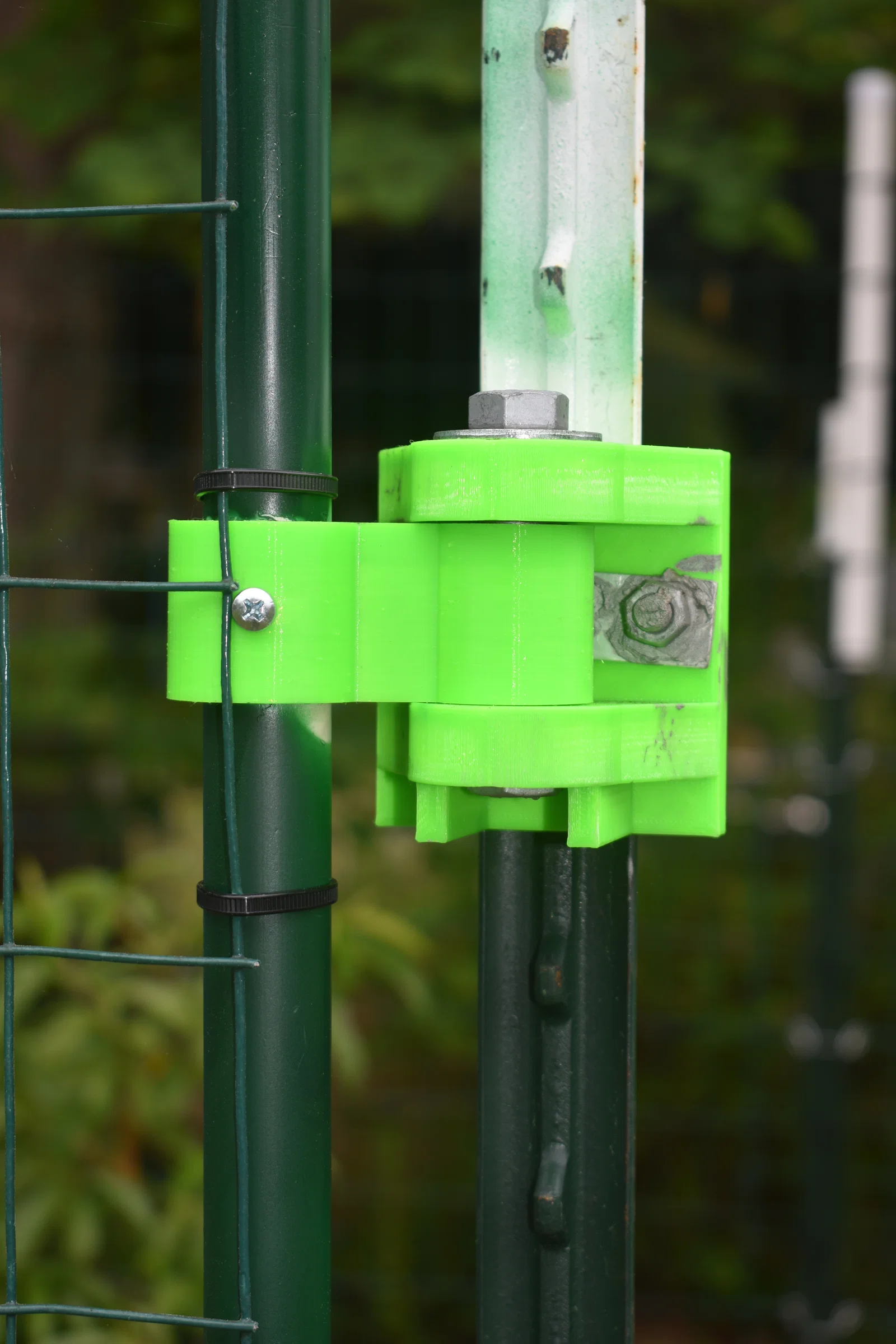Bộ T-Post hinge support & hinge để treo cổng ống PVC 3/4" cho hàng rào T-post/lưới thép. Có khoét âm cho tán 1/2" để chia tải qua chốt, dùng U-bolt ty 5/16"; khuyến nghị infill 10–20% cubic.