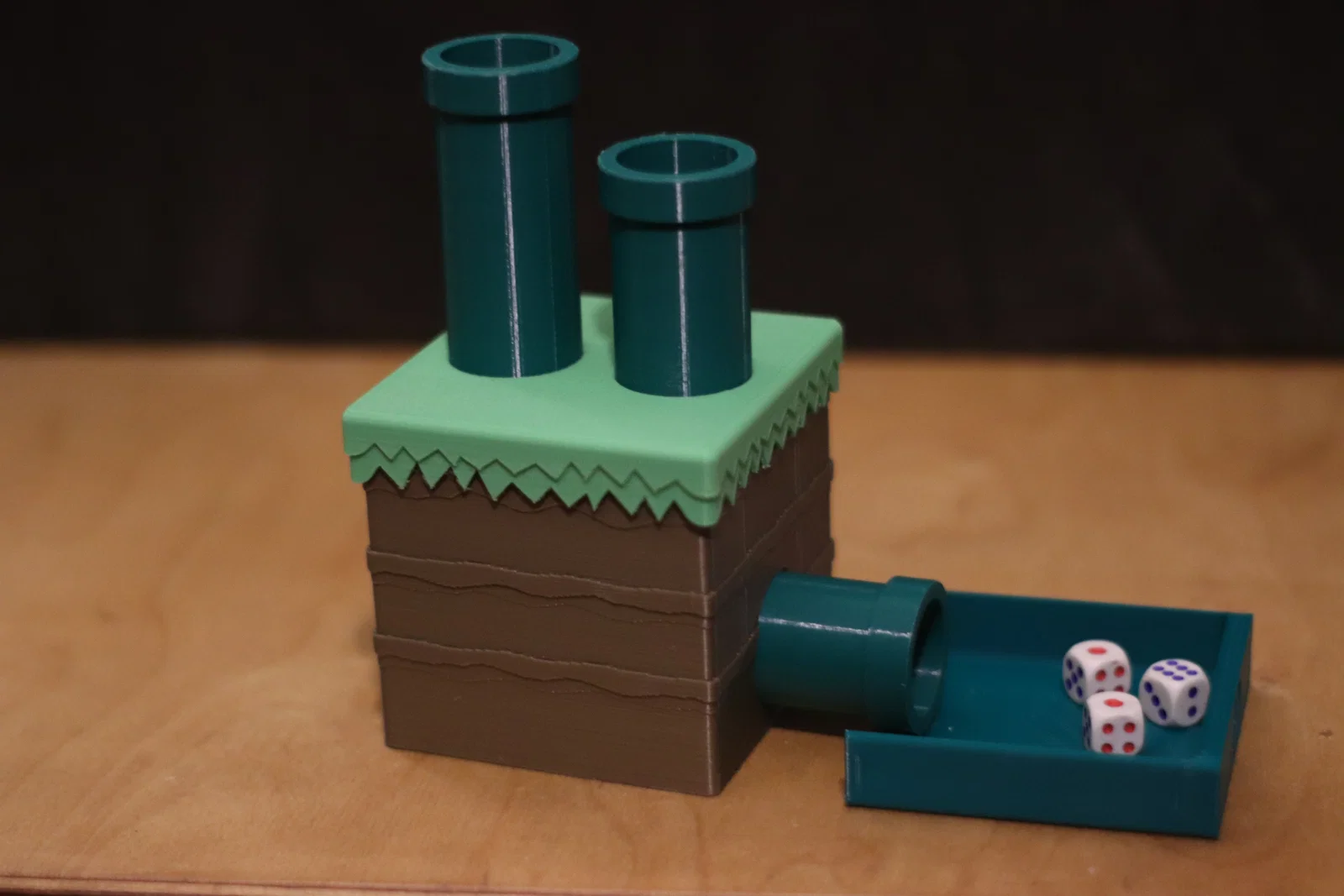Tháp thả xúc xắc phong cách ống Mario, thiết kế tối giản và dễ in. Có ngăn chứa xúc xắc trong khối và khay hứng giúp không rơi khỏi bàn. Dung sai: 0,2; ống 0,1; ngăn kéo 0,3.