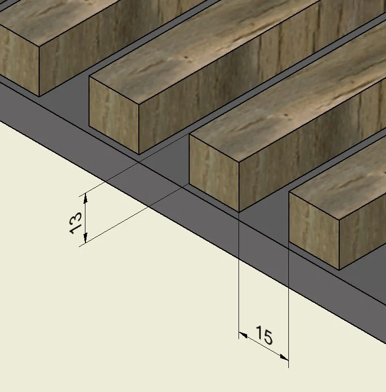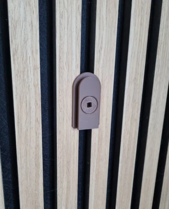 Giá treo tường cho panel tiêu âm Bauhaus, 100% in 3D được. Không cần thêm vật liệu như vít và không làm hư panel, tháo ra cũng gọn. Thiết kế theo chuẩn 15mm giữa các thanh gỗ và 13mm từ mép trên tới lớp nỉ.