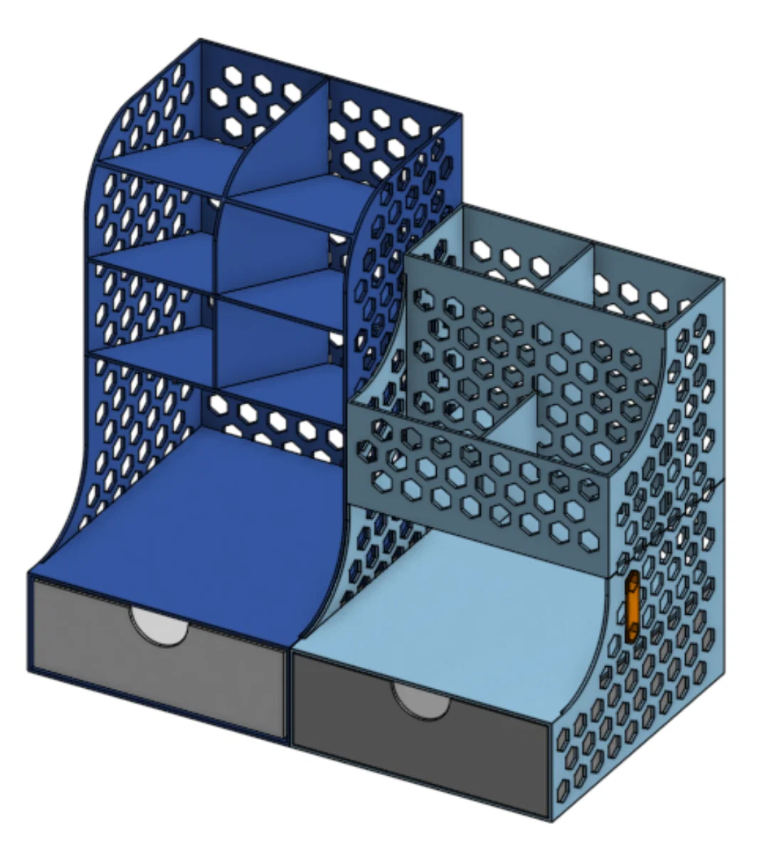 Để dễ in, tất cả các phần đã được xoay sẵn theo hướng in tối ưu. Bạn có thể chỉ in một bên, nhưng khi ghép cả hai lại với nhau thì sẽ vừa khít và có thêm không gian chứa đồ.