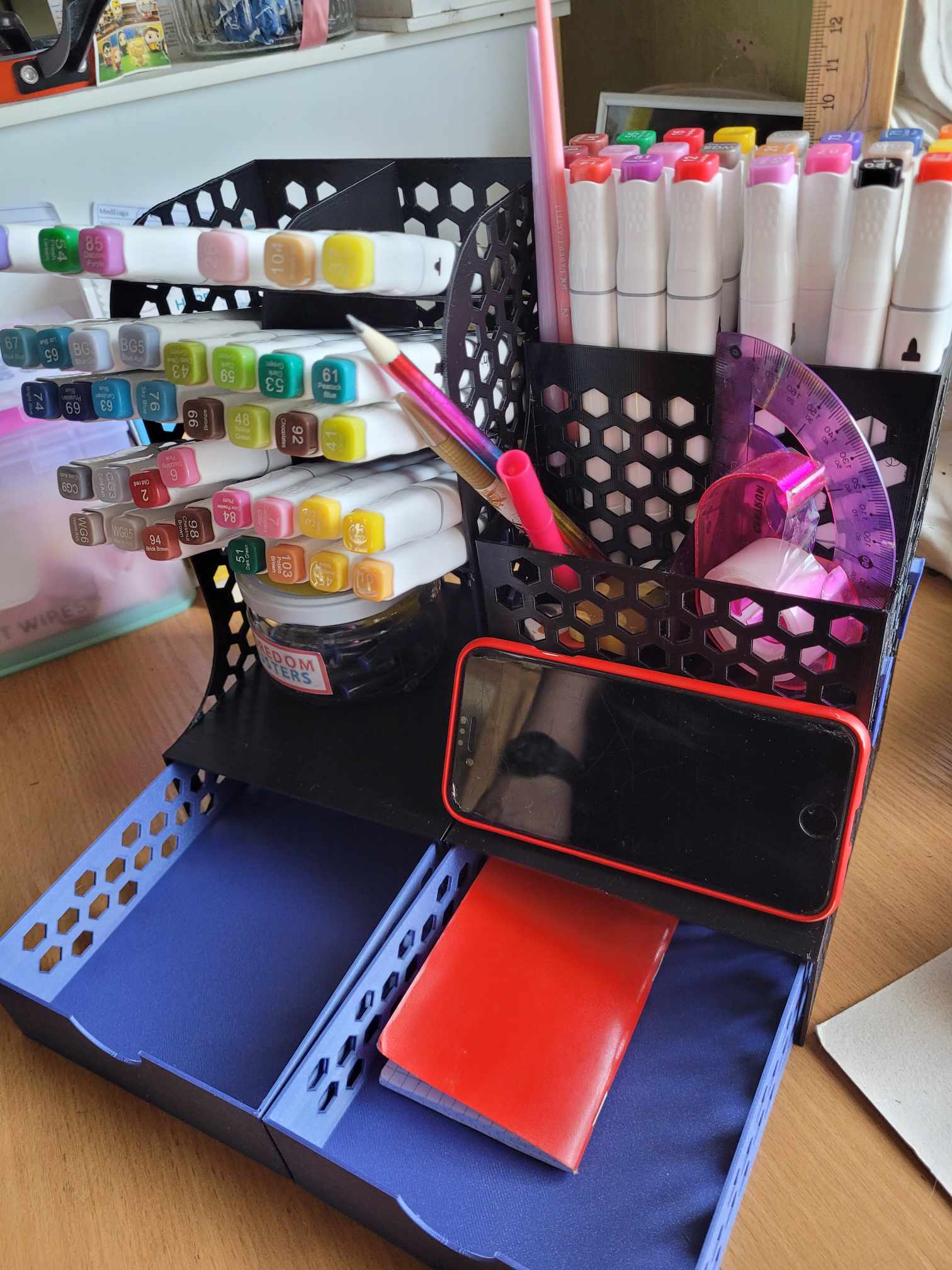 Khay cắm bút kiêm đồ tổ chức bàn làm việc, thiết kế đơn giản giúp mặt bàn gọn gàng hơn. Các phần đã được xoay sẵn để in dễ và tối ưu; có thể in 1 bên hoặc ghép 2 bên để tăng không gian.