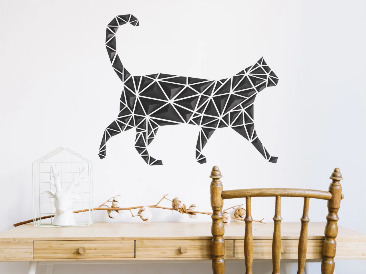 Mẫu Geometric Cat wall art gồm 111 mảnh ghép trang trí treo tường. Các mảnh có số tham chiếu ở mặt sau và có PDF hướng dẫn lắp ráp. Có thể cố định bằng velcro tape, băng keo hai mặt, hot glue hoặc blu-tack.