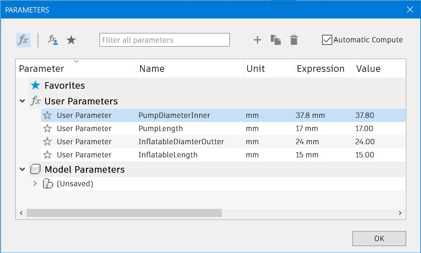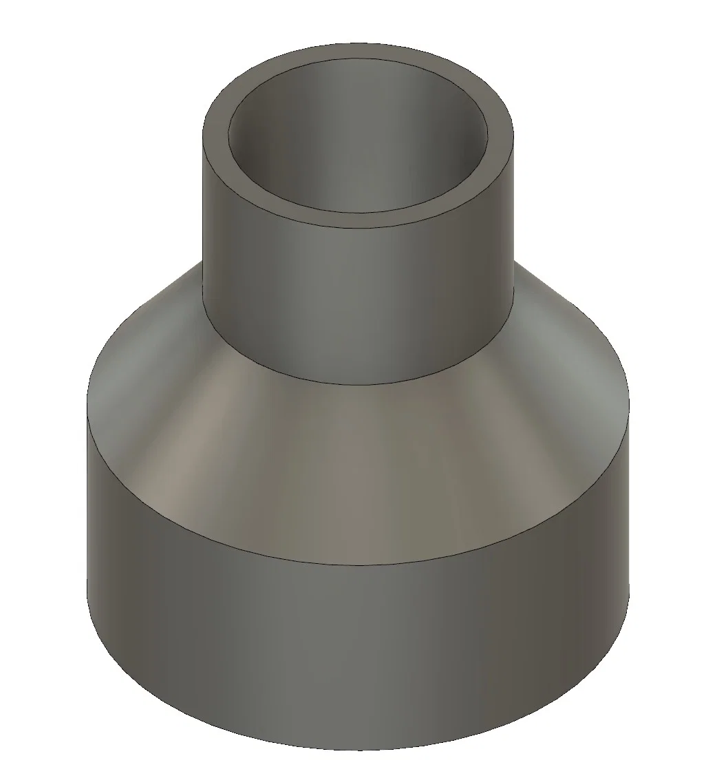 File Fusion 360 cho Parametric Air Pump Nozzle, cho phép tùy chỉnh kích thước đầu nozzle theo nhu cầu. Gồm 4 parameters (đường kính/chiều dài cho đầu bơm và đầu bơm vào vật), góc chuyển 50° và thành dày 2mm.
