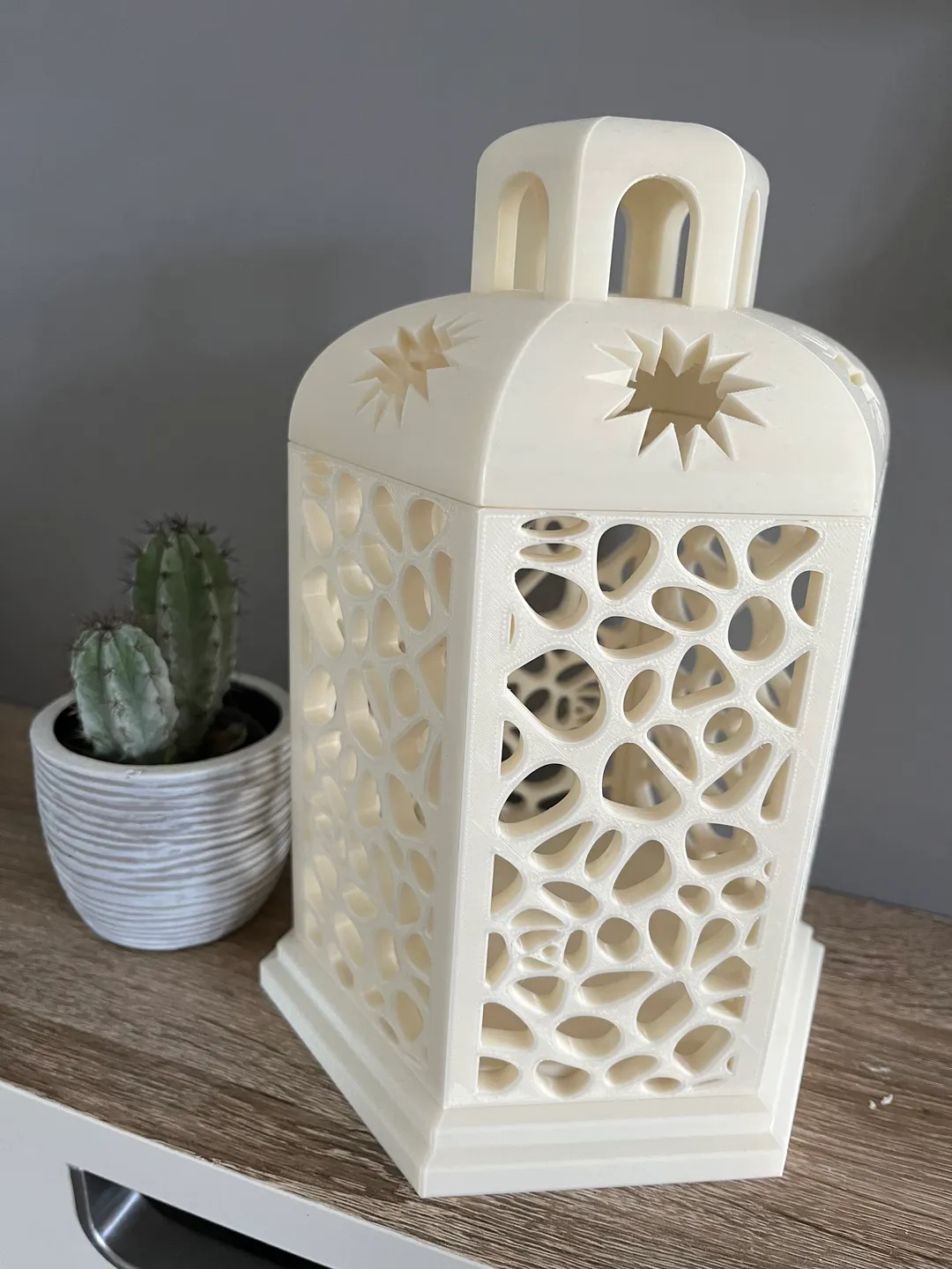 Voronoi Lantern là mẫu đèn lồng trang trí nhà với hoạ tiết Voronoi đẹp mắt, tạo ánh sáng ấm cúng. Chỉ nên dùng với nến LED/nguồn sáng đèn, không khuyến nghị dùng nến thật.