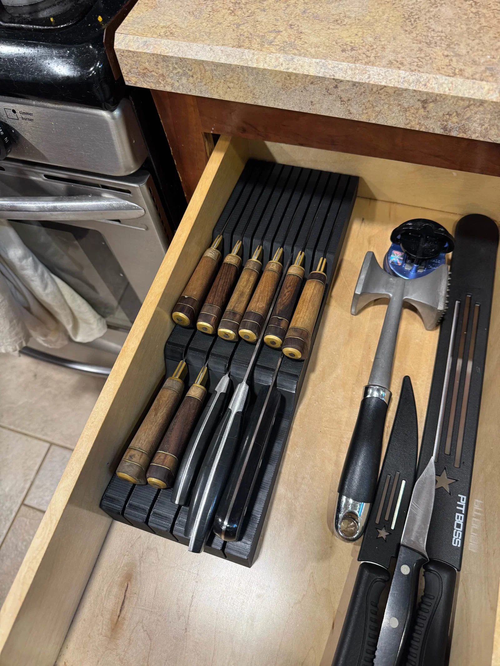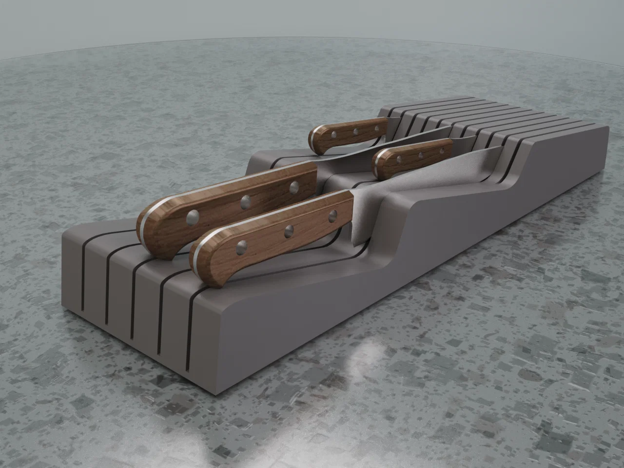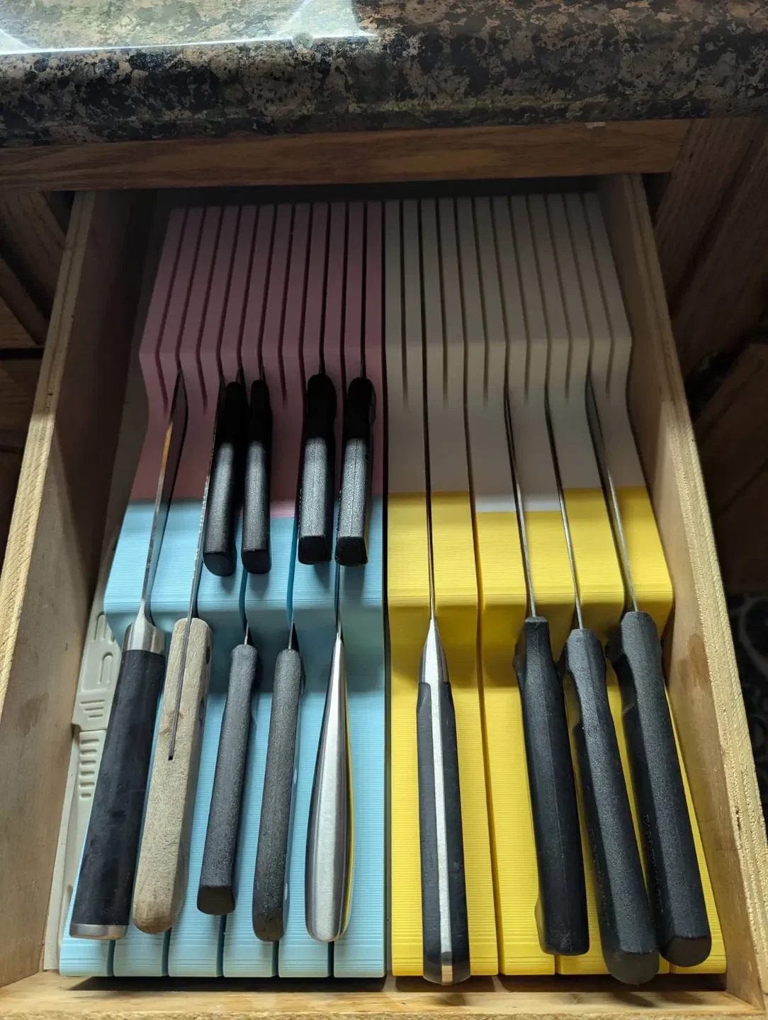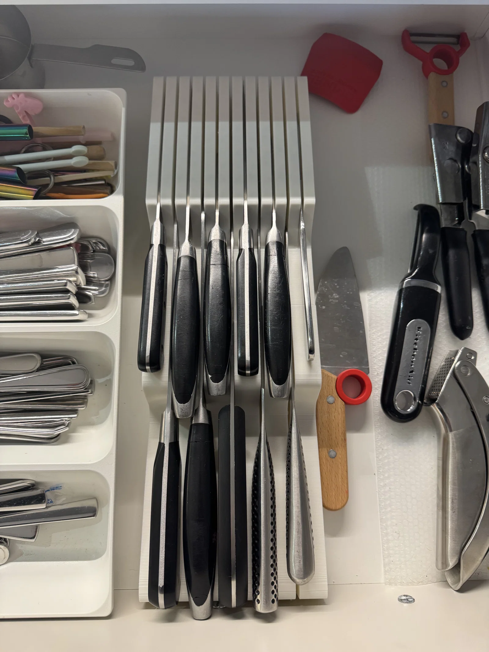Khay đựng dao đặt trong ngăn kéo giúp cất dao an toàn, bảo vệ lưỡi dao và tay khỏi bị cắt. Chứa tối đa 11 dao nhiều kích cỡ, vừa hầu hết ngăn kéo. Kích thước 40×12.5×5 cm; in 2 phần để hợp đa số bàn in.