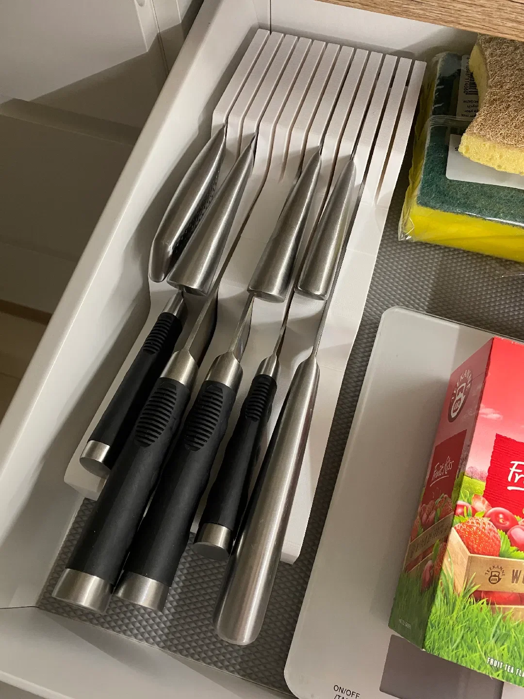 Khay đựng dao này giúp bạn sắp xếp dao gọn gàng, đồng thời bảo vệ lưỡi dao và tay bạn khỏi nguy cơ bị đứt/cắt. Khay có thể chứa tối đa 11 cây dao với nhiều kích cỡ khác nhau và vừa với hầu hết các ngăn kéo, nên bạn có thể để gọn trong ngăn kéo thay vì chiếm chỗ trên mặt bếp.