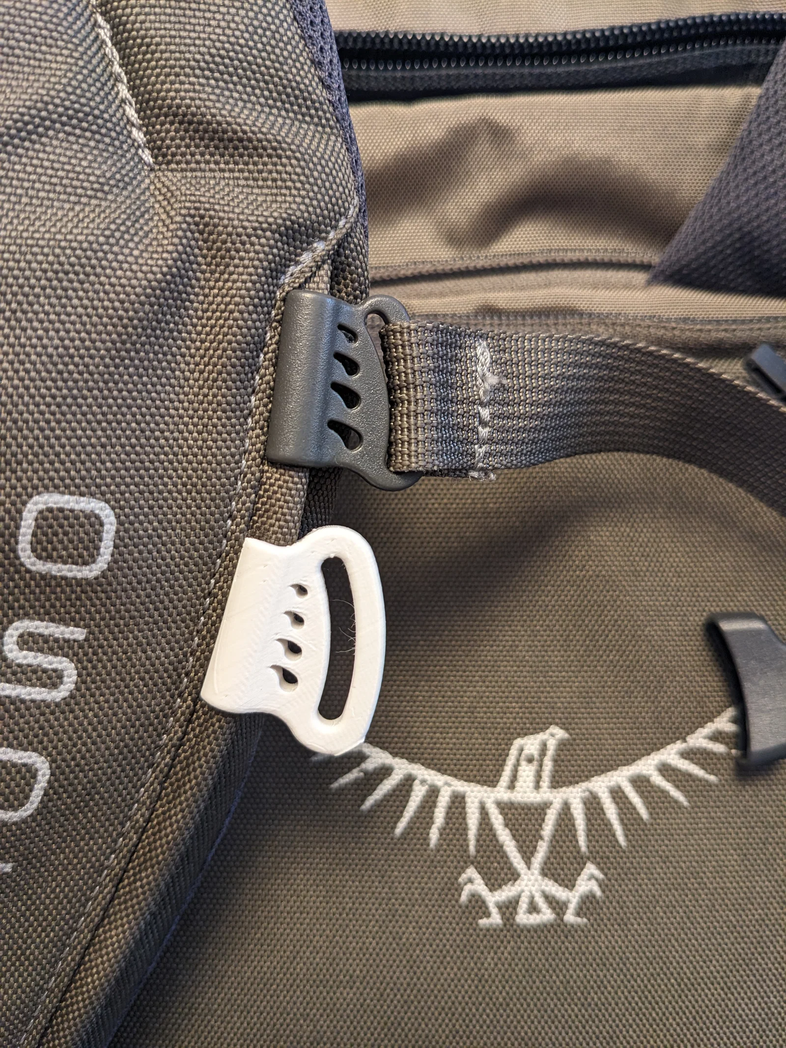 Clip thay thế cho dây ngực balo Osprey, thiết kế dày hơn để phù hợp in 3D. Có kèm Fusion model để chỉnh fitment/clearance. Khuyến nghị in bằng PC; in phẳng theo phần cong, dùng brim, không supports.