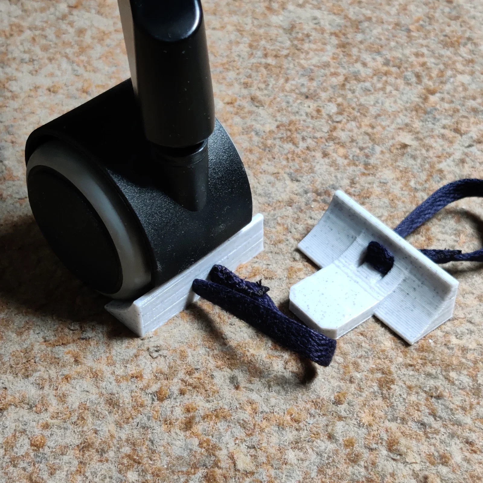 Thiết kế wheel stopper cho ghế văn phòng IKEA Markus, giúp ghế không bị trôi khi chơi sim racing (đạp phanh). Dạng nêm luồn từ phía sau bánh xe, có thể gắn thêm dây để rút ra dễ hơn.