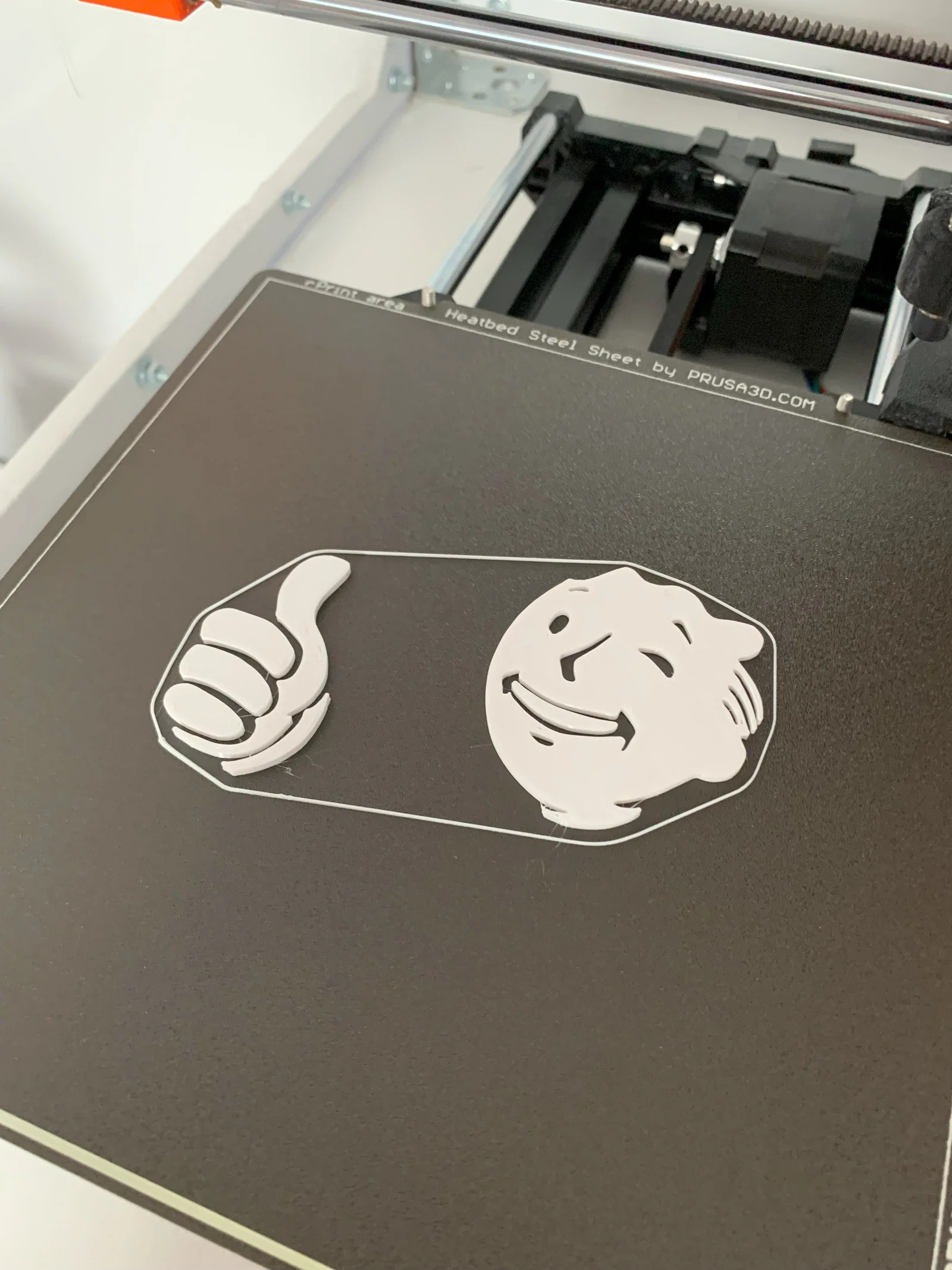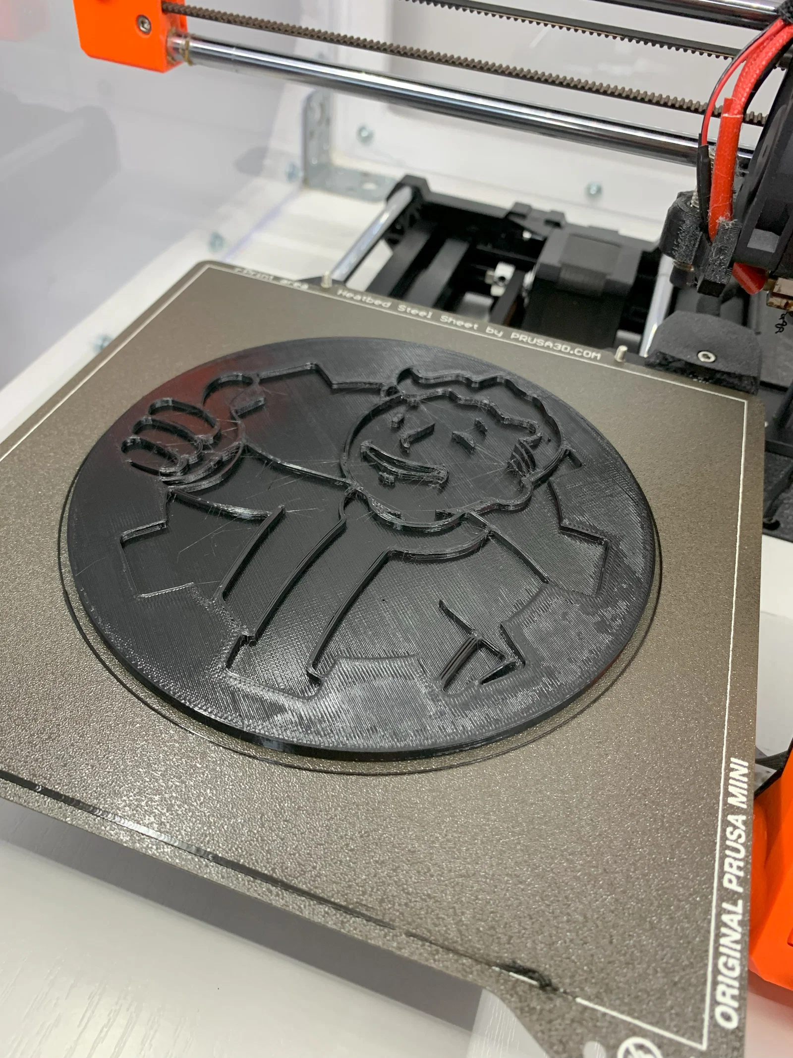 Huy hiệu Vault Boy trong game Fallout, thiết kế nhiều lớp để in nhiều màu. Bản mẫu sử dụng 4 màu (Black, Blue, White, Yellow – Prusament) và có thể tách phần trong slicer để in thêm màu. Đường kính 140mm.