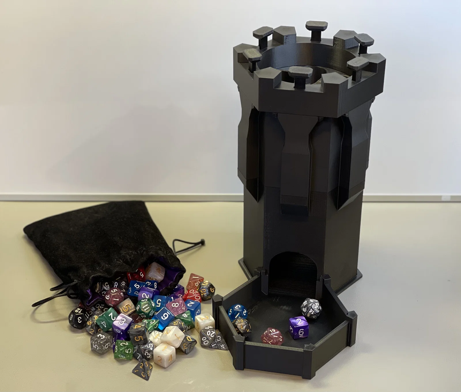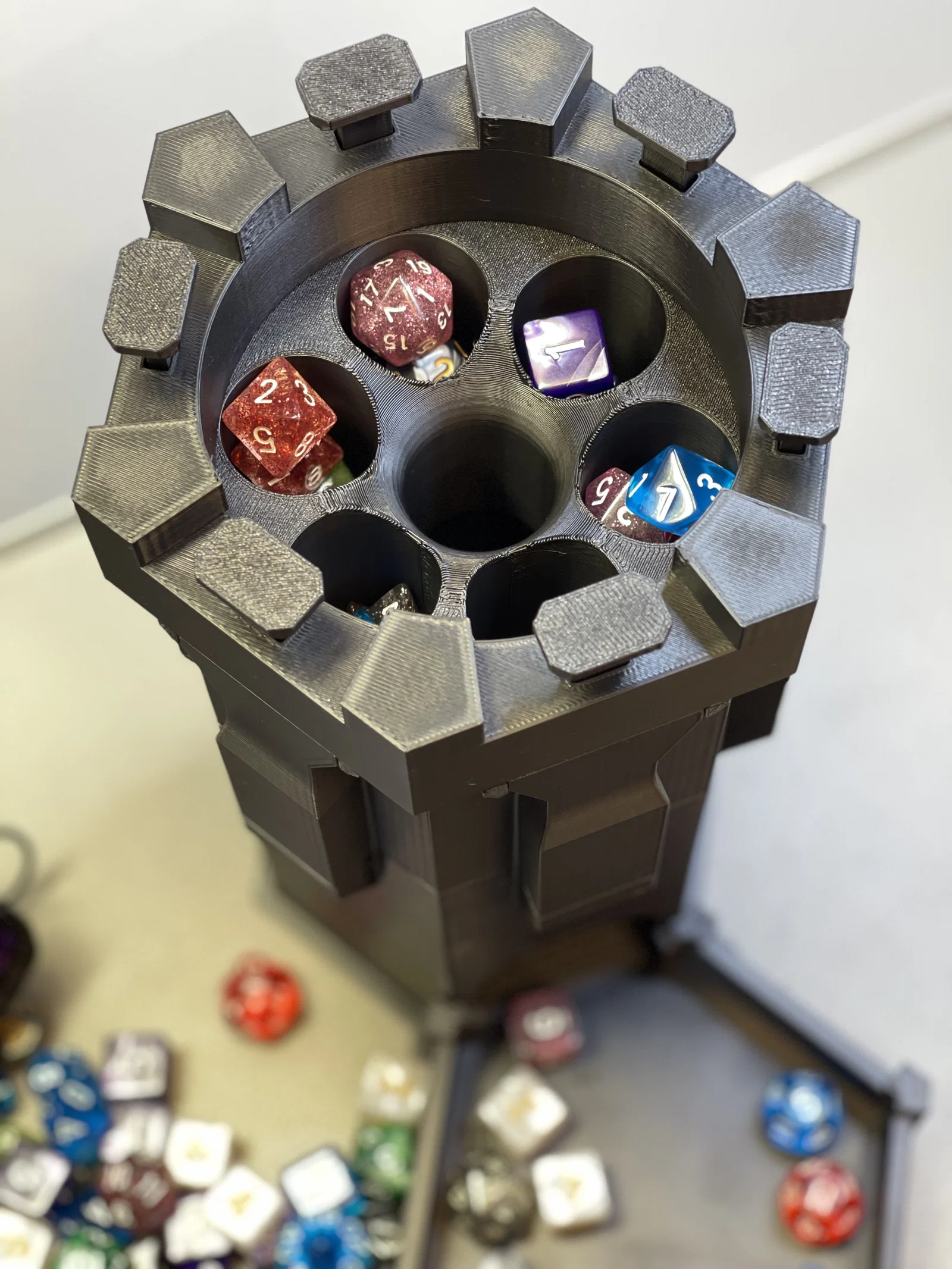 - Compact (18cm), không có ngăn dice và không có “Press to roll” (kiểu dice tower truyền thống, sau này bạn có thể nâng cấp).