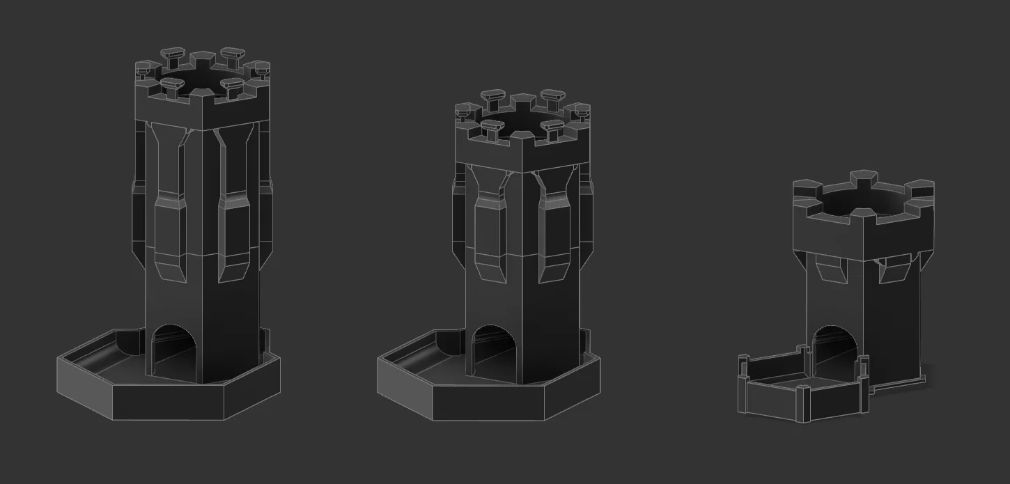 Dice tower có 3 phiên bản, và có 2 kiểu khay (tray) khác nhau.