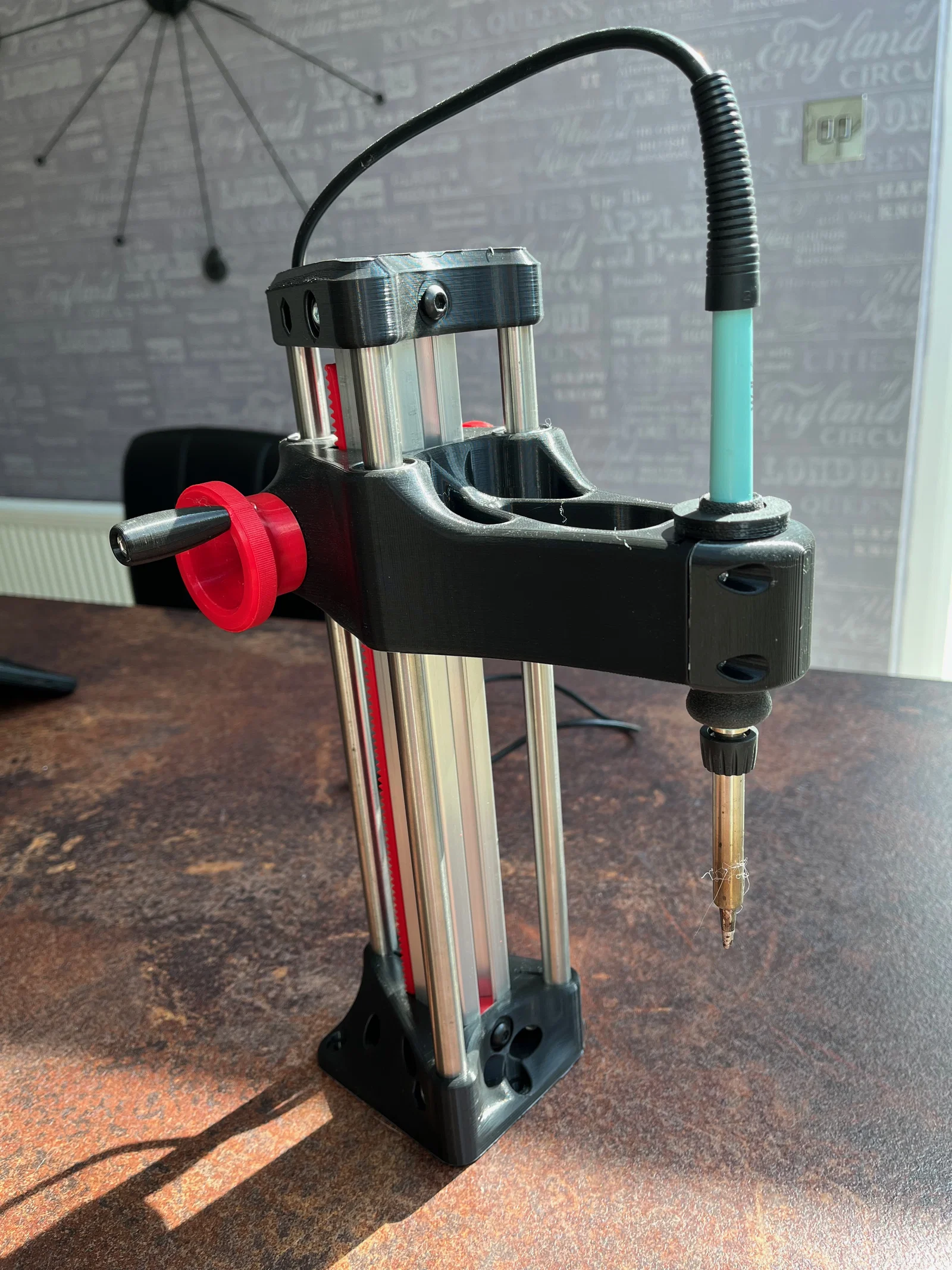 Đây chỉ là bộ hướng dẫn lắp ráp chi tiết kèm các file STL để in, gồm các miếng insert dùng để giữ đai ốc M4 và M6 trong thanh extrusion ở giữa. Cuối cùng là một file làm giá đỡ mỏ hàn, phù hợp với Weller WEP 70, in bằng filament dẻo (flexible filament).