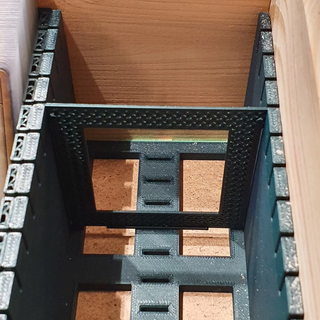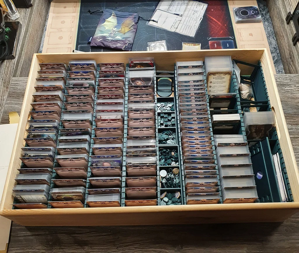 Giải pháp lưu trữ tuỳ biến cho Arkham Horror LCG, dùng thùng gỗ Hornbach và các khay/holder in 3D. Kích thước phần chính 125x75x75 mm, vừa khe để đựng token collectors; có thêm bản holder dài 135 mm.
