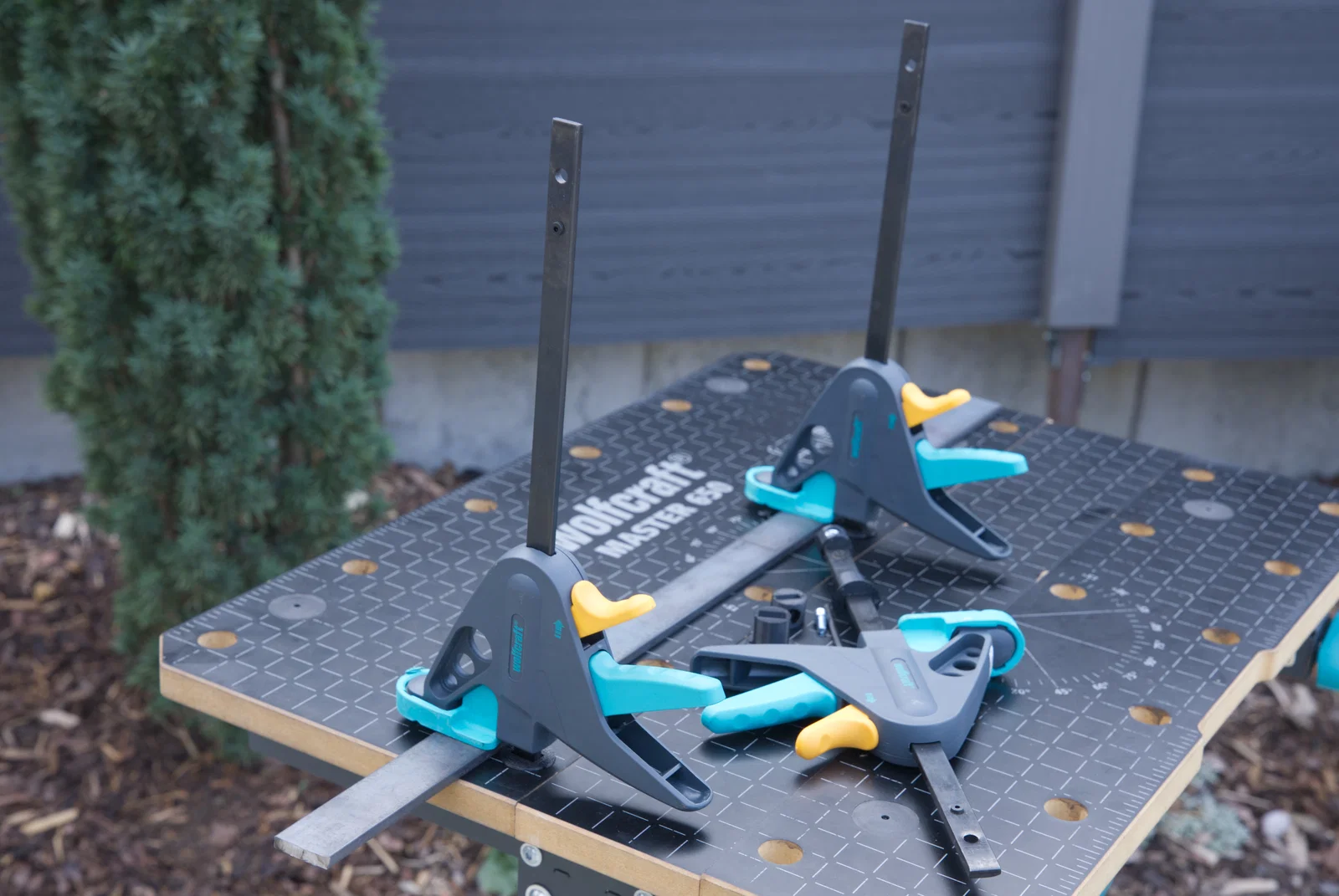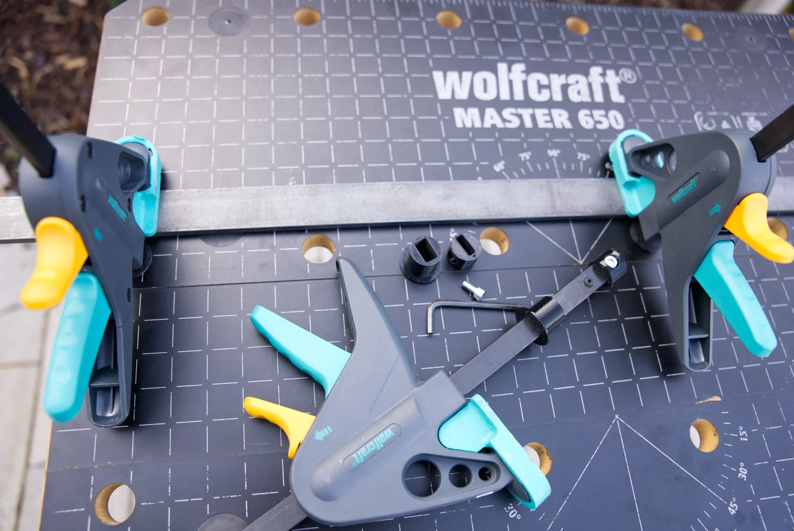 Hai món chi tiết giúp biến kẹp một tay (one-hand clamp) của Wolfcraft thành kẹp dọc cho bàn work table, dùng được với mọi loại bàn có lỗ 20mm. Nên không chỉ giới hạn ở bàn Wolfcraft Master 650 như trong hình, cũng không phụ thuộc vào độ dày mặt bàn cụ thể.