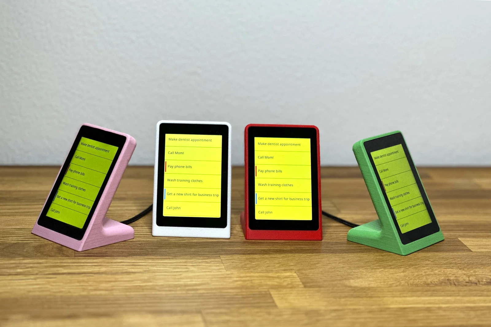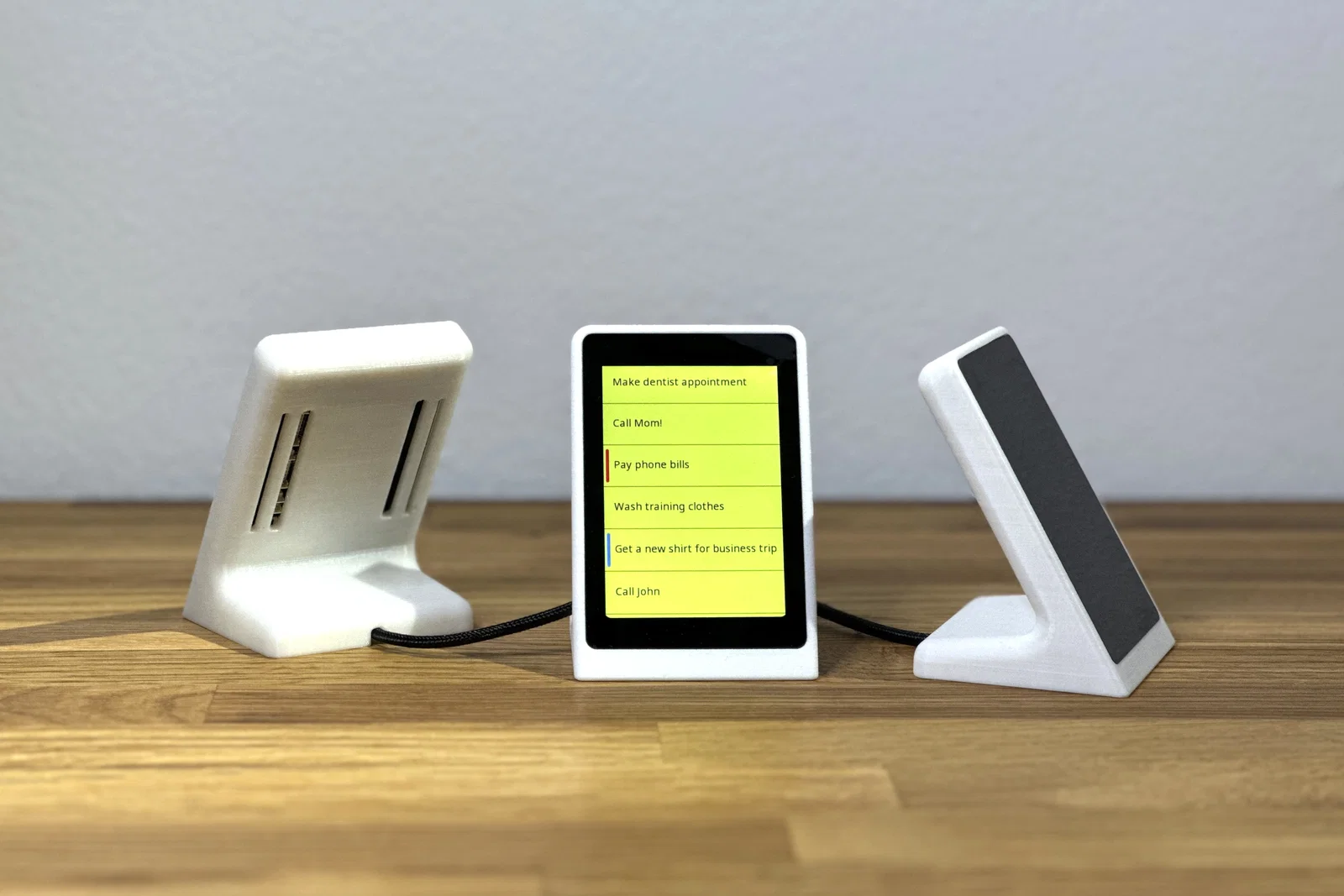 Vỏ/đế cho module màn hình WT32-SC01 Plus: bấm vào là khít, có rãnh giữ cáp phía dưới. Cần đầu USB‑C dạng góc để cắm board. Vẫn thao tác được các cổng I/O, Debug và Speaker. Thiết kế cho FriendlyStack Reminder.
