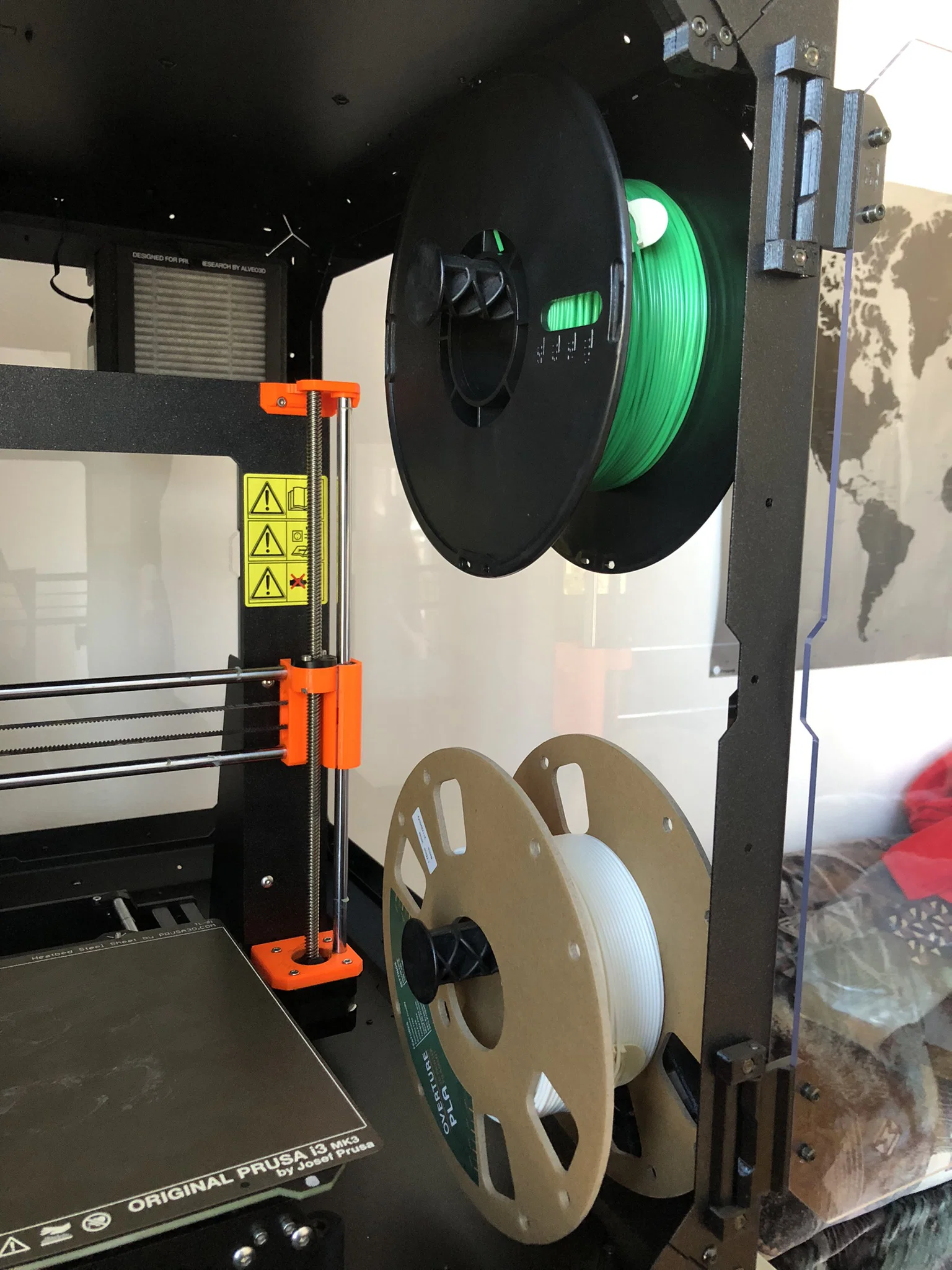 Giá đỡ spool phụ in 3D cho Original Prusa Enclosure, bản mirror để gắn góc dưới bên phải ngay dưới holder chính. Giúp đặt 2 cuộn spool trong enclosure và hỗ trợ đổi màu mượt hơn.