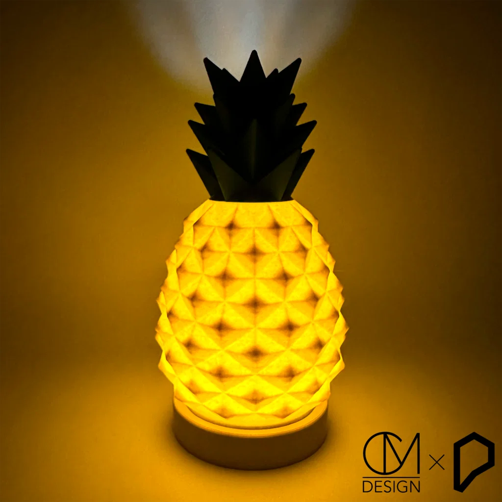 Mẫu Pineapple Light lấy cảm hứng từ màu Subscription tháng 4 của Protopasta (tựa smoothie thanh long), tạo nên phong cách nhiệt đới. In đủ các phần, vặn crown, lắp LED puck light rồi bắt vào đế.