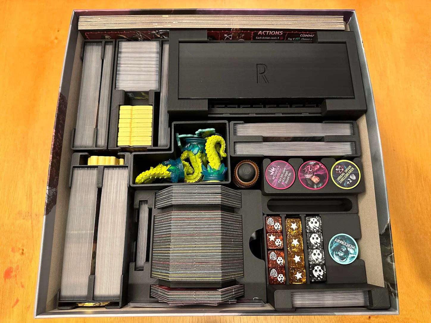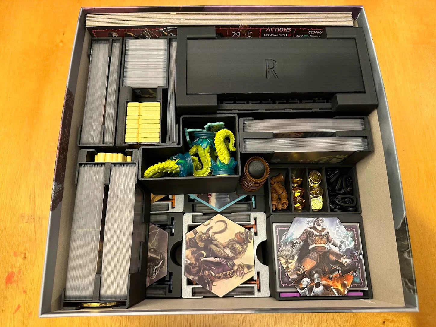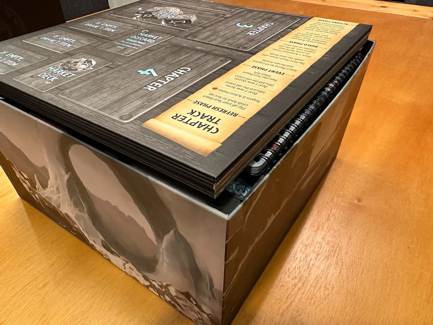 Mục tiêu nữa là tăng tốc setup và dọn game, cái này đạt được phần lớn nhờ đặt thẳng các khay lên khu vực chơi. Khay Items có một khe dành cho item market display, và khi các thẻ faction/blessing/reference đã rút khỏi các khe phía sau Items rồi thì trong suốt ván chơi sẽ không cần đụng tới nữa. Chapter cards nên được rút ngay lúc setup, còn các Quest bị bỏ (discarded) thì cứ để gọn phía sau hộc thẻ (card well).