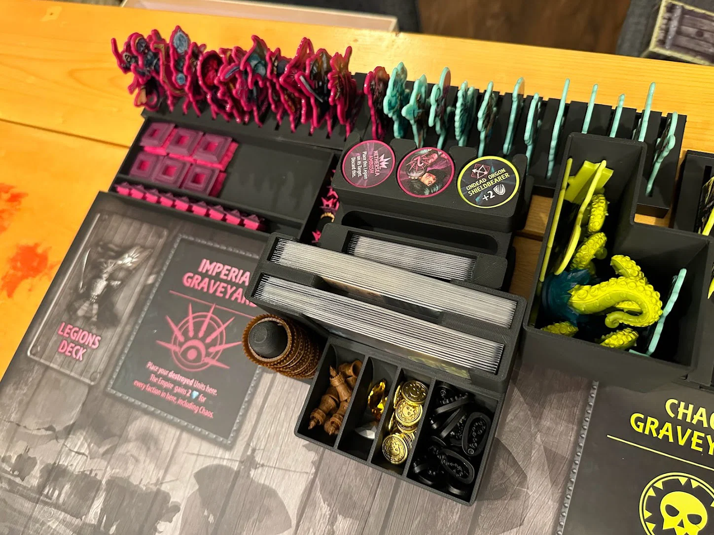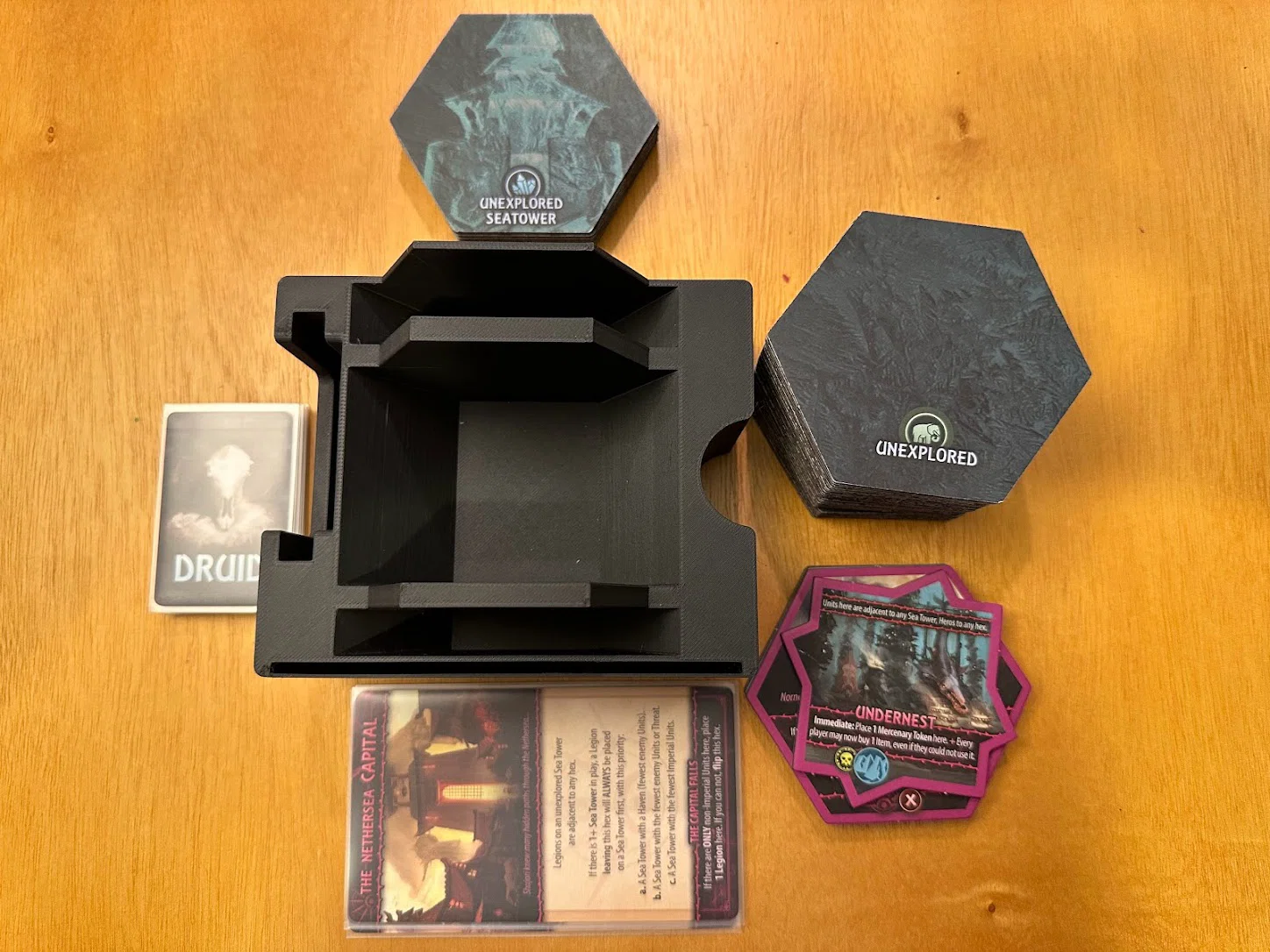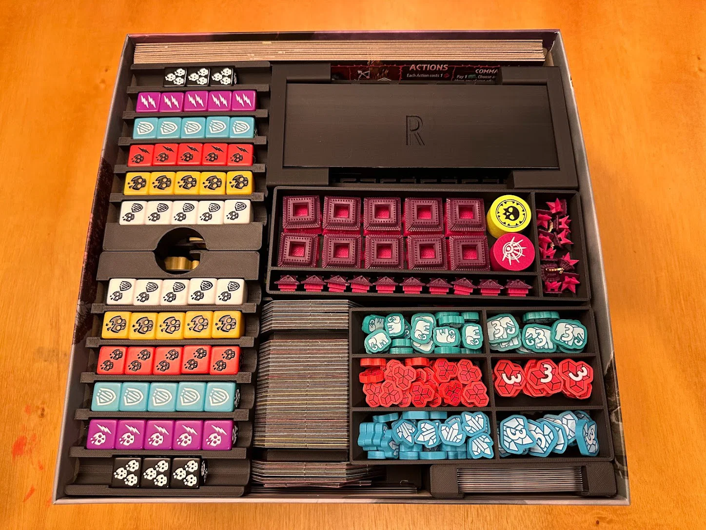 Mục tiêu nữa là tăng tốc setup và dọn game, cái này đạt được phần lớn nhờ đặt thẳng các khay lên khu vực chơi. Khay Items có một khe dành cho item market display, và khi các thẻ faction/blessing/reference đã rút khỏi các khe phía sau Items rồi thì trong suốt ván chơi sẽ không cần đụng tới nữa. Chapter cards nên được rút ngay lúc setup, còn các Quest bị bỏ (discarded) thì cứ để gọn phía sau hộc thẻ (card well).