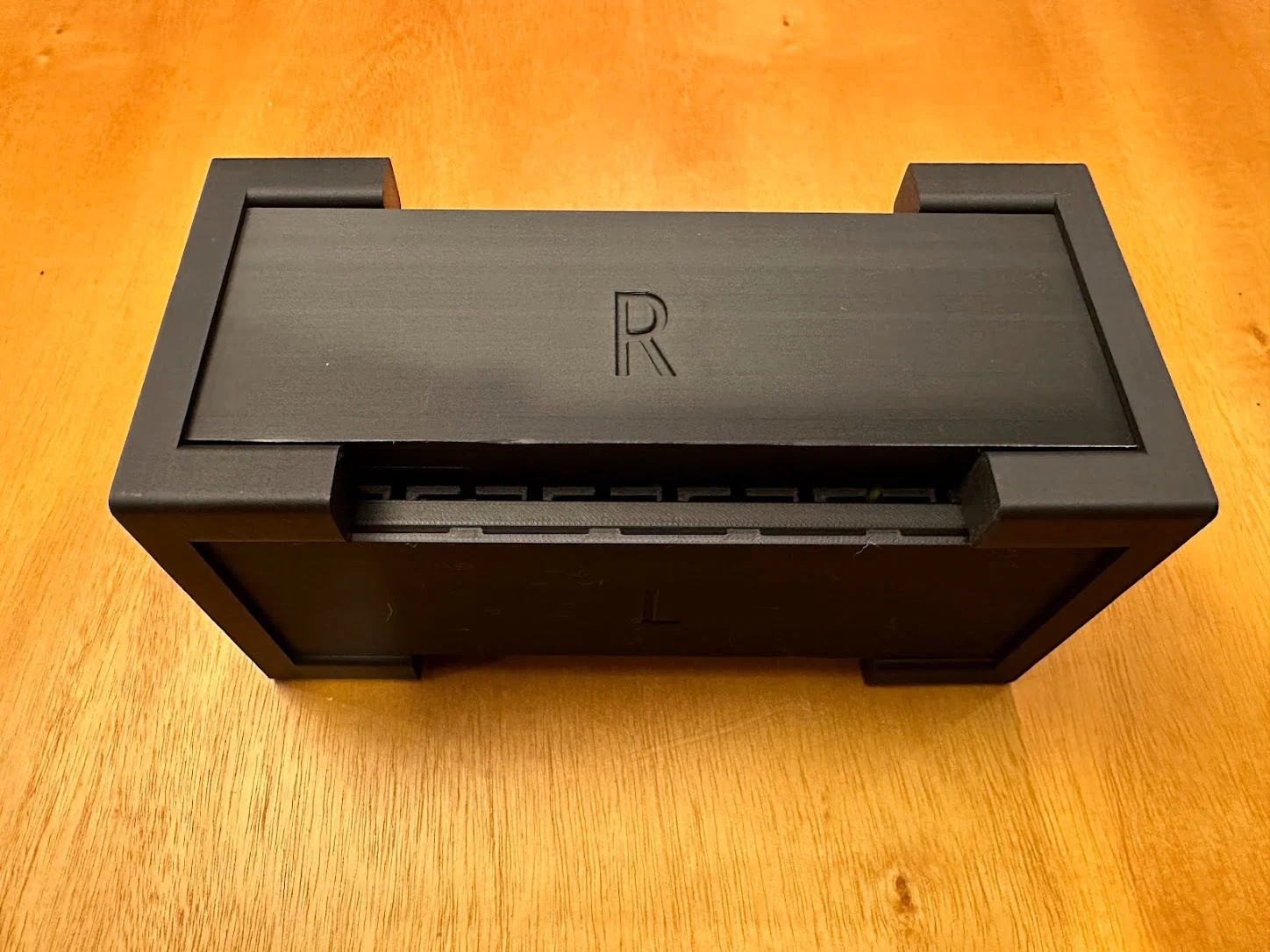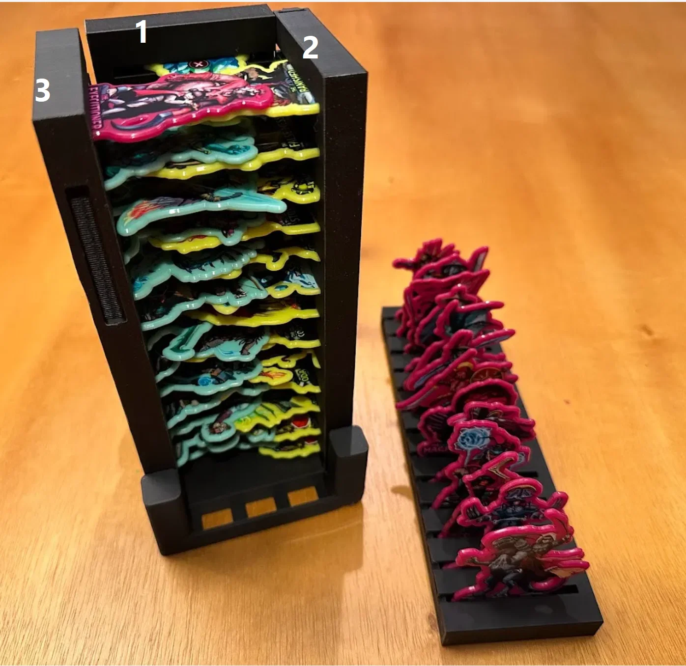 3 hình cuối cho thấy cách mình xếp các chồng standee. Dùng một nắp/cap làm đế, mình canh cho rack 1 và rack 2 thẳng hàng (ví dụ rack 1 đứng “đè lên/ở phía trên” rack 2). Sau đó mình luồn rack 3 “ở dưới” các standee của rack 2. Cách này giảm độ nghiêng do đặt standee với góc quá lớn so với cái kế bên. Rack cuối cùng thì mình đưa phần đáy vào giá trước, rồi nghiêng nhẹ đặt lên trên phần còn lại. Đôi lúc phải nhấc nhẹ rack 2 và 3 lên để đủ khoảng trống. Các rack không cần phải khít tuyệt đối với nhau—các nắp/caps có đủ dung sai để giữ chúng lại dù rack có lệch nhẹ.