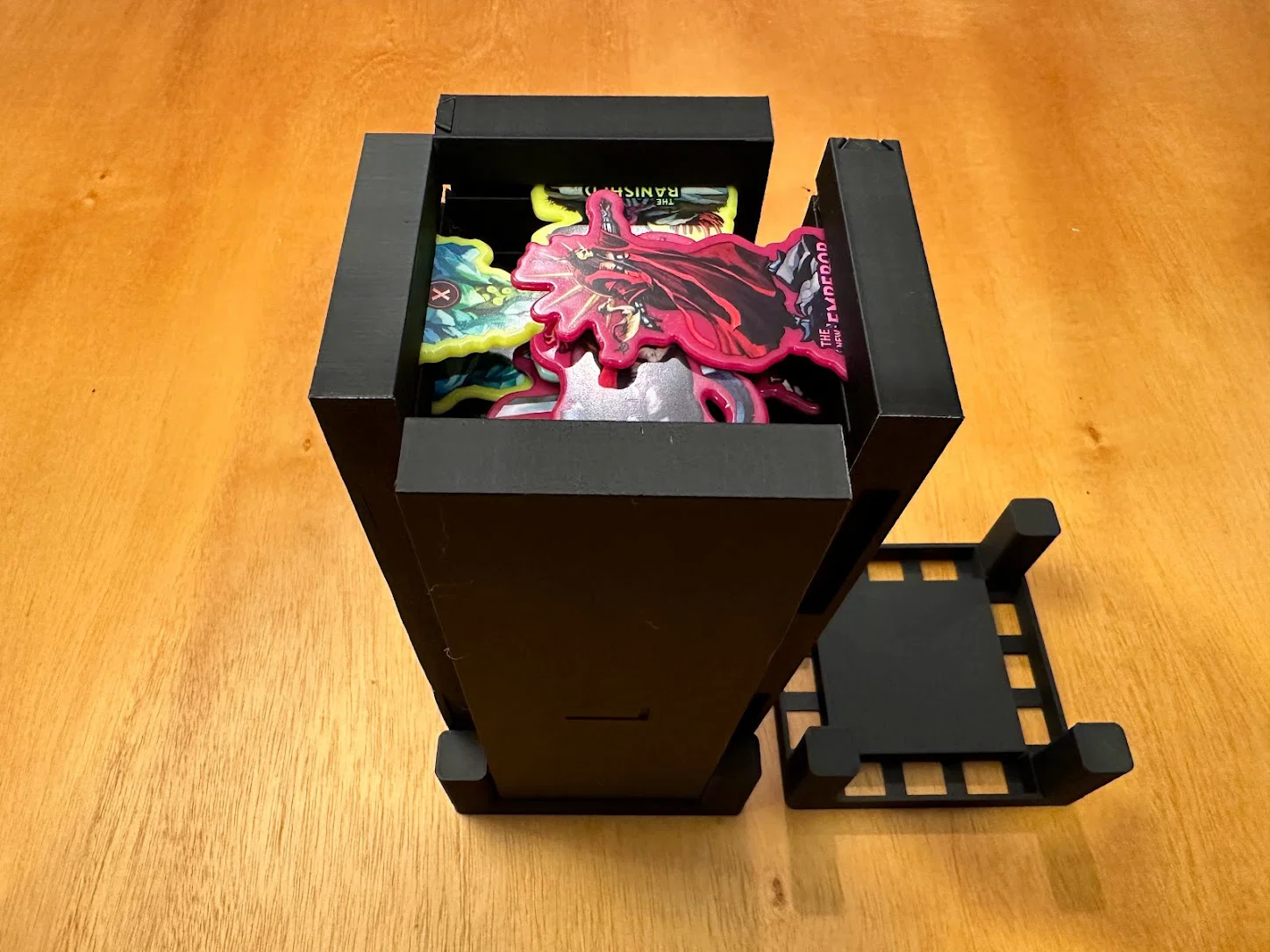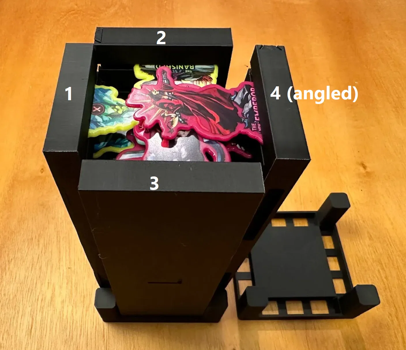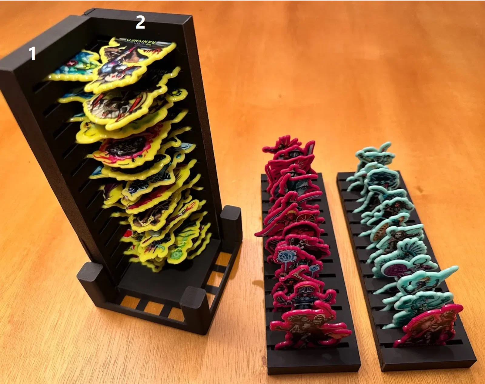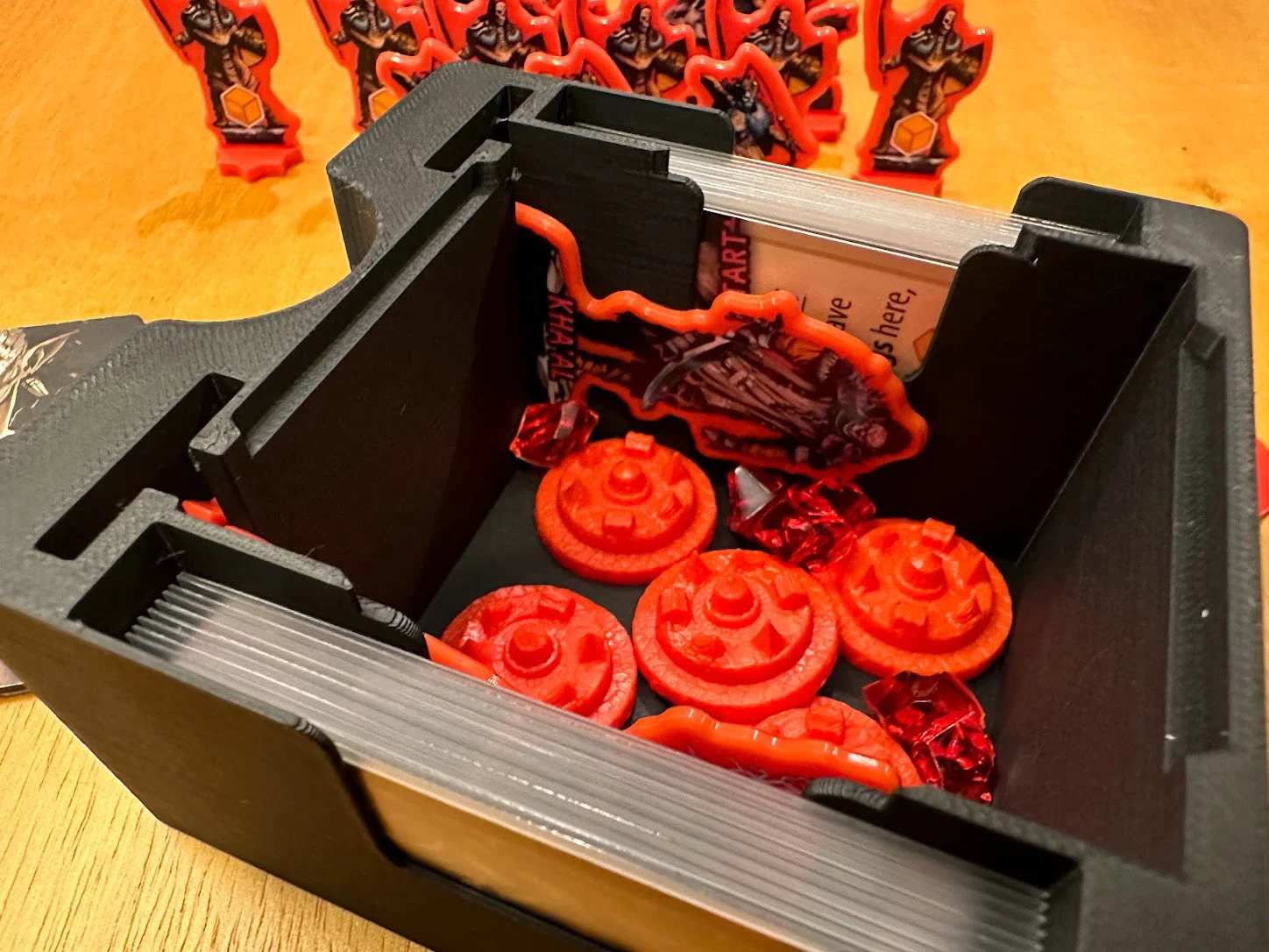 Trọng tâm mục tiêu của mình là làm giải pháp cất standee mà không cần tháo ra lắp lại giữa các ván, đồng thời giúp nhận diện nhanh lúc chơi: cần loại enemy nào thì nhìn là ra. Sau nhiều lần chỉnh sửa, mình chốt được phương án dạng xếp chồng/ăn khớp (stackable/tessellating), cố định bằng nắp (caps), chứa được tất cả trừ 3 standee lớn nhất. Standees được giữ trong đúng ngàm (brackets) của nó với một nắp trượt (sliding lid). Ba standee lớn nhất thì để trong hộp Curse.