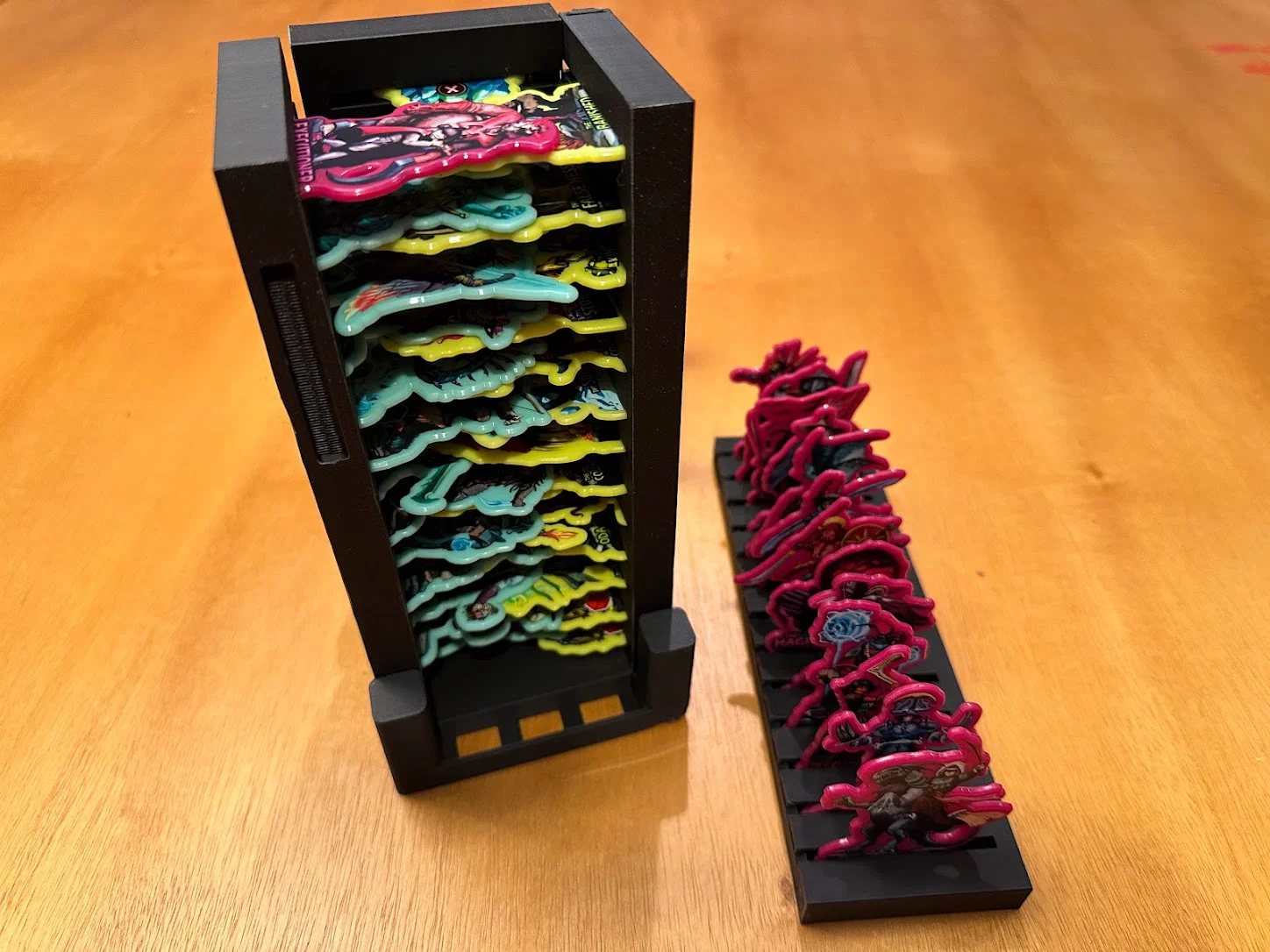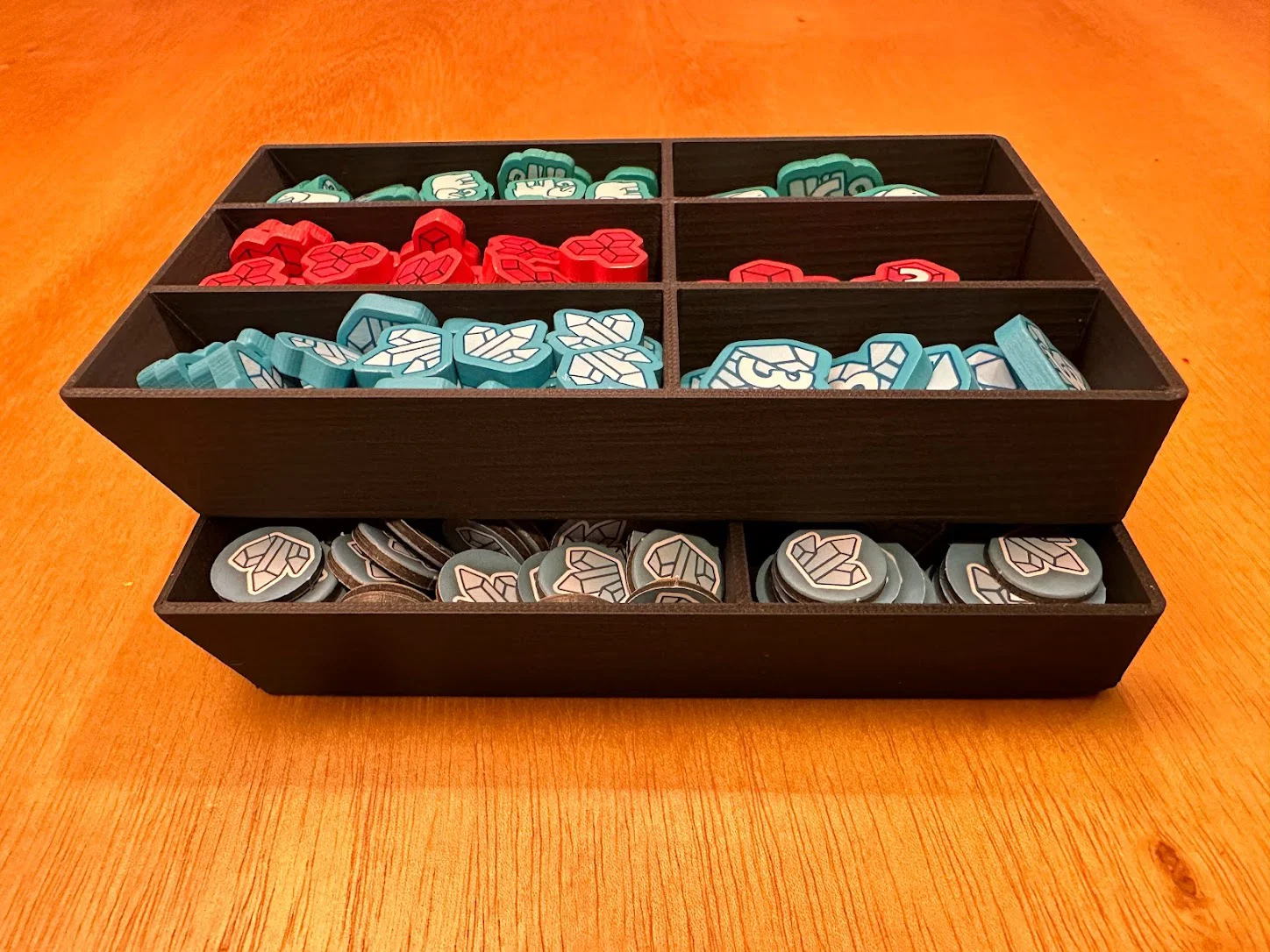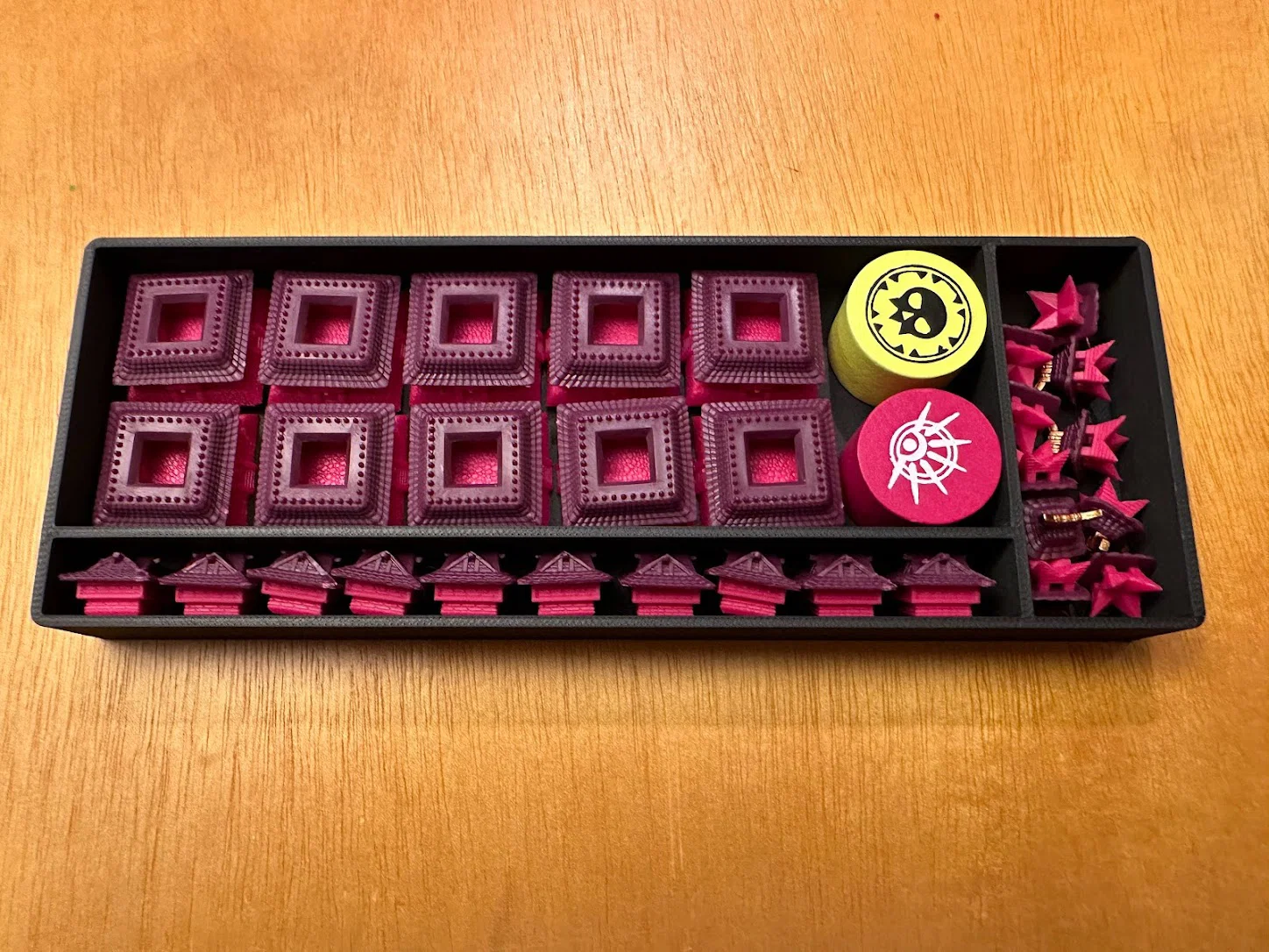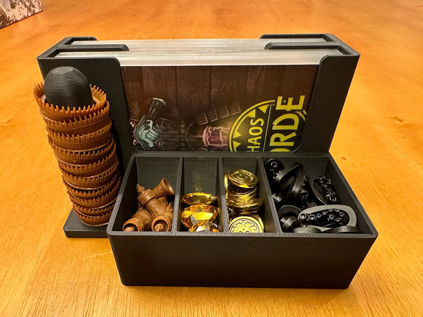 Trọng tâm mục tiêu của mình là làm giải pháp cất standee mà không cần tháo ra lắp lại giữa các ván, đồng thời giúp nhận diện nhanh lúc chơi: cần loại enemy nào thì nhìn là ra. Sau nhiều lần chỉnh sửa, mình chốt được phương án dạng xếp chồng/ăn khớp (stackable/tessellating), cố định bằng nắp (caps), chứa được tất cả trừ 3 standee lớn nhất. Standees được giữ trong đúng ngàm (brackets) của nó với một nắp trượt (sliding lid). Ba standee lớn nhất thì để trong hộp Curse.