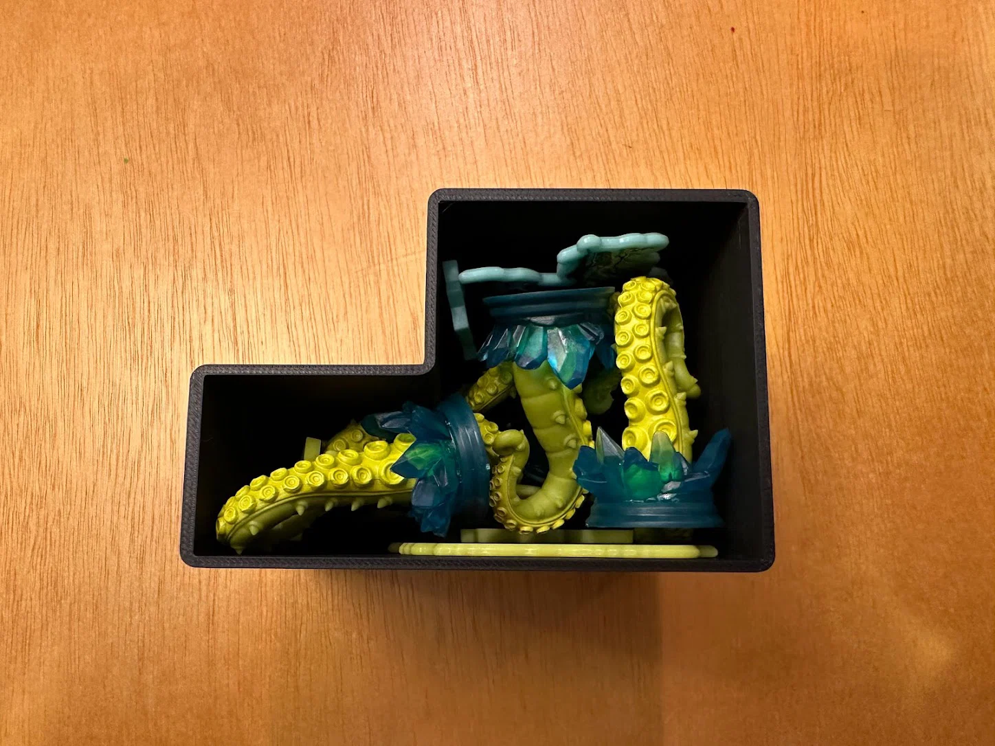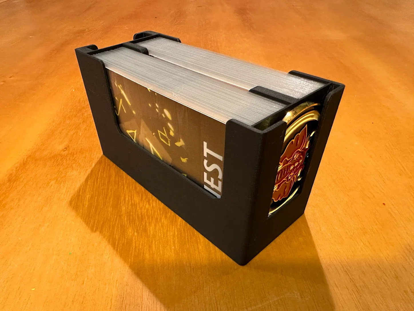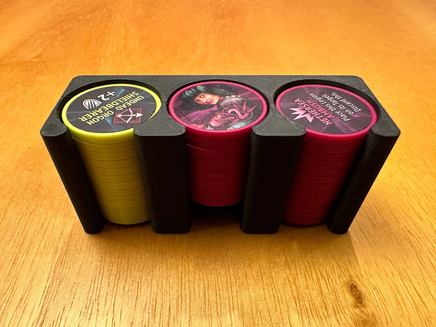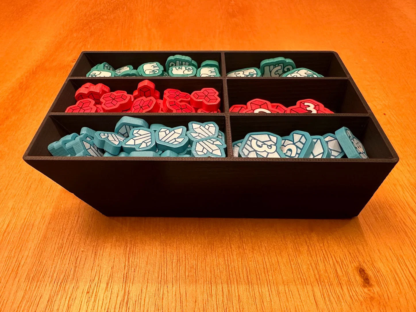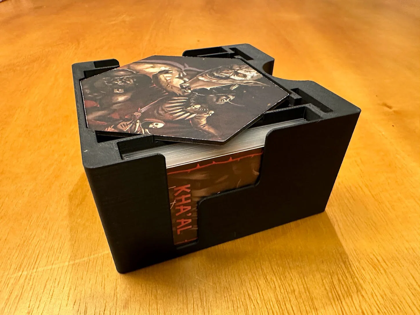 Trọng tâm mục tiêu của mình là làm giải pháp cất standee mà không cần tháo ra lắp lại giữa các ván, đồng thời giúp nhận diện nhanh lúc chơi: cần loại enemy nào thì nhìn là ra. Sau nhiều lần chỉnh sửa, mình chốt được phương án dạng xếp chồng/ăn khớp (stackable/tessellating), cố định bằng nắp (caps), chứa được tất cả trừ 3 standee lớn nhất. Standees được giữ trong đúng ngàm (brackets) của nó với một nắp trượt (sliding lid). Ba standee lớn nhất thì để trong hộp Curse.