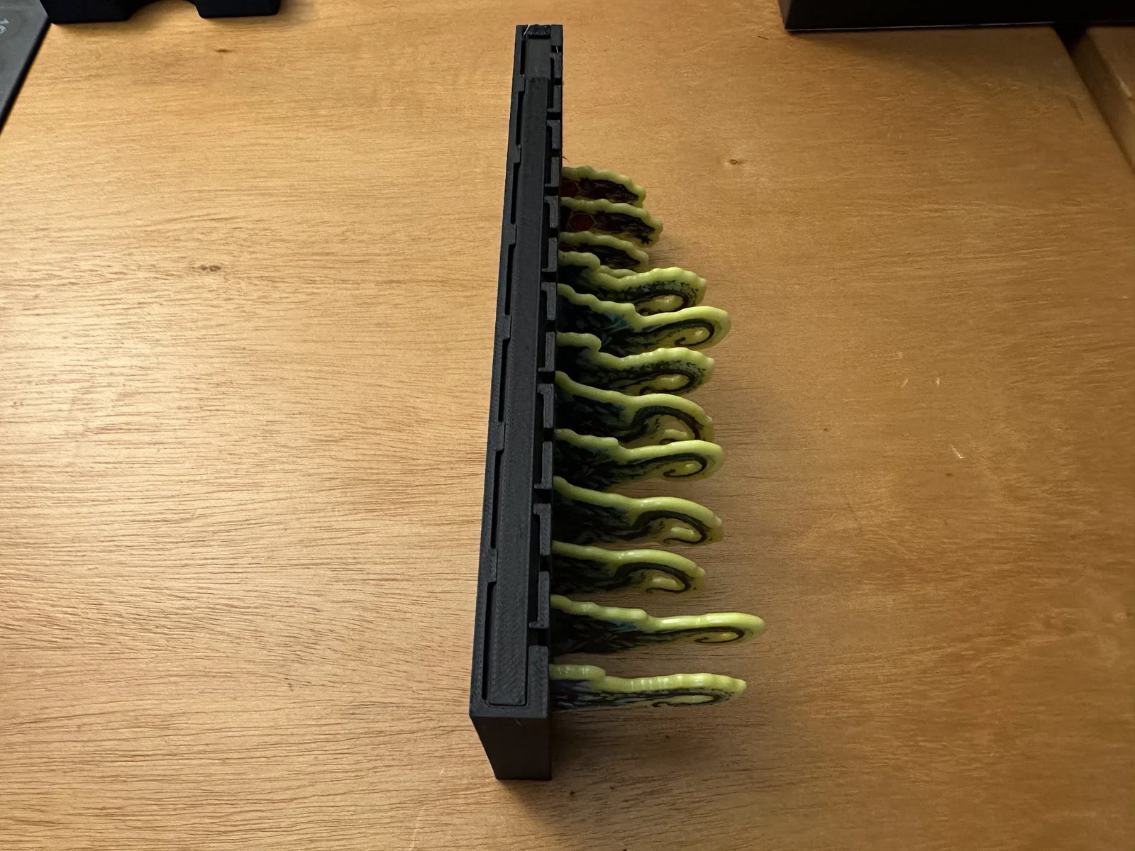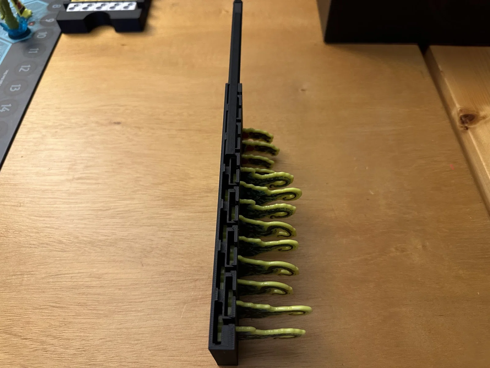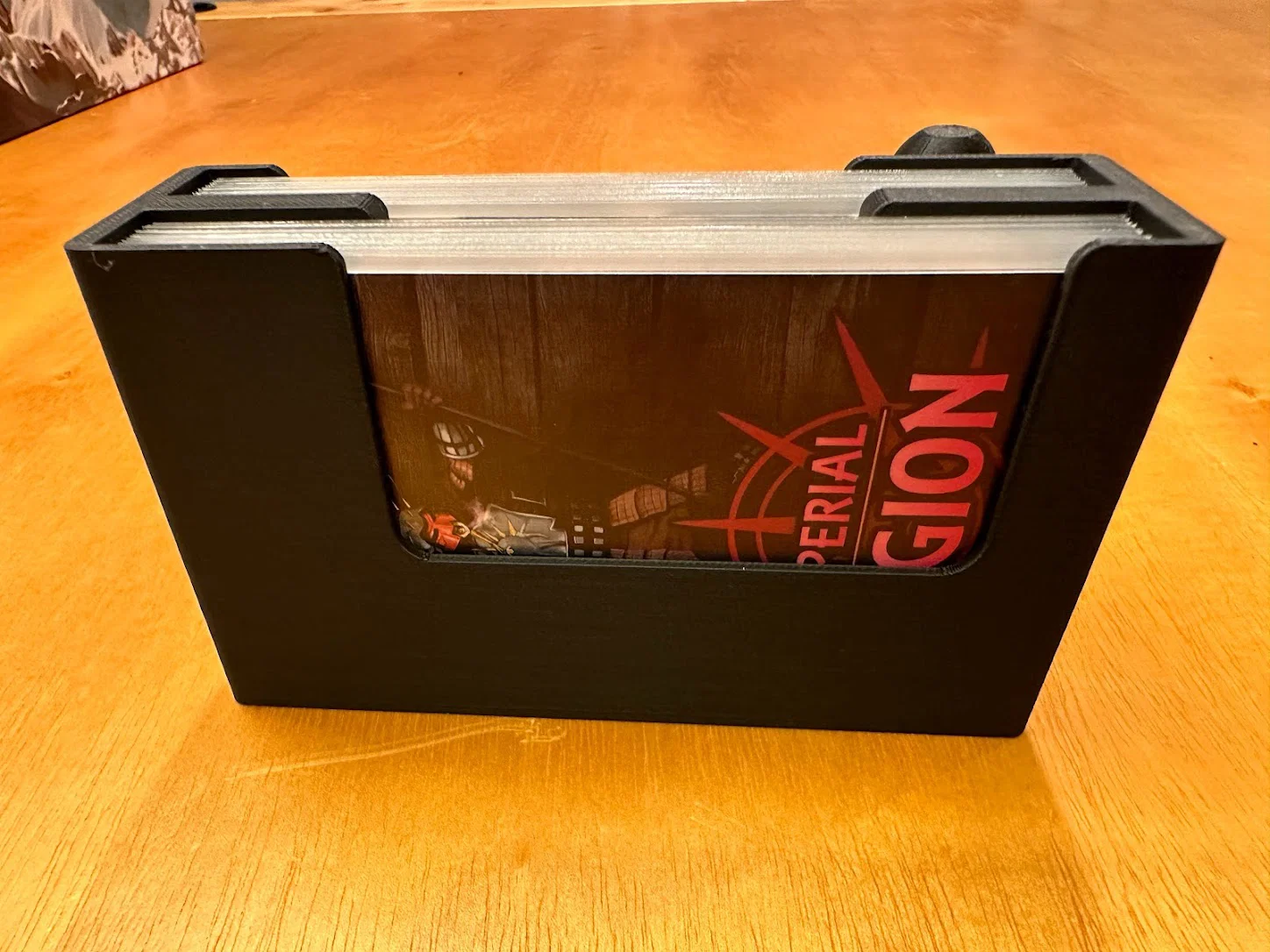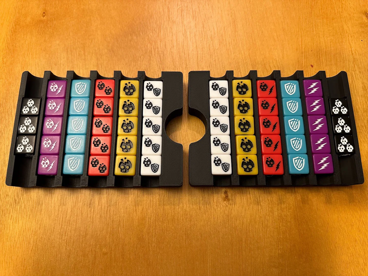 Trọng tâm mục tiêu của mình là làm giải pháp cất standee mà không cần tháo ra lắp lại giữa các ván, đồng thời giúp nhận diện nhanh lúc chơi: cần loại enemy nào thì nhìn là ra. Sau nhiều lần chỉnh sửa, mình chốt được phương án dạng xếp chồng/ăn khớp (stackable/tessellating), cố định bằng nắp (caps), chứa được tất cả trừ 3 standee lớn nhất. Standees được giữ trong đúng ngàm (brackets) của nó với một nắp trượt (sliding lid). Ba standee lớn nhất thì để trong hộp Curse.