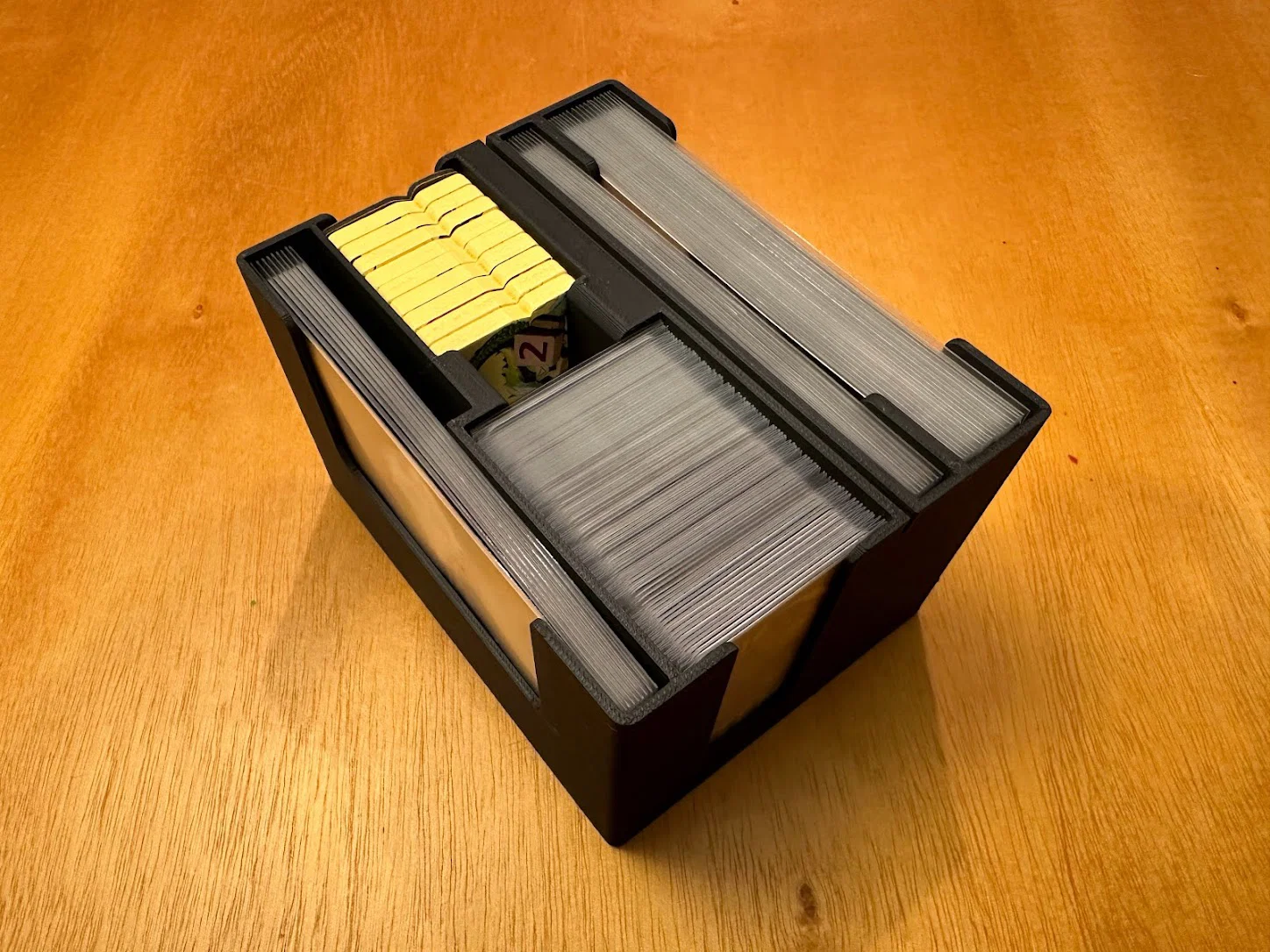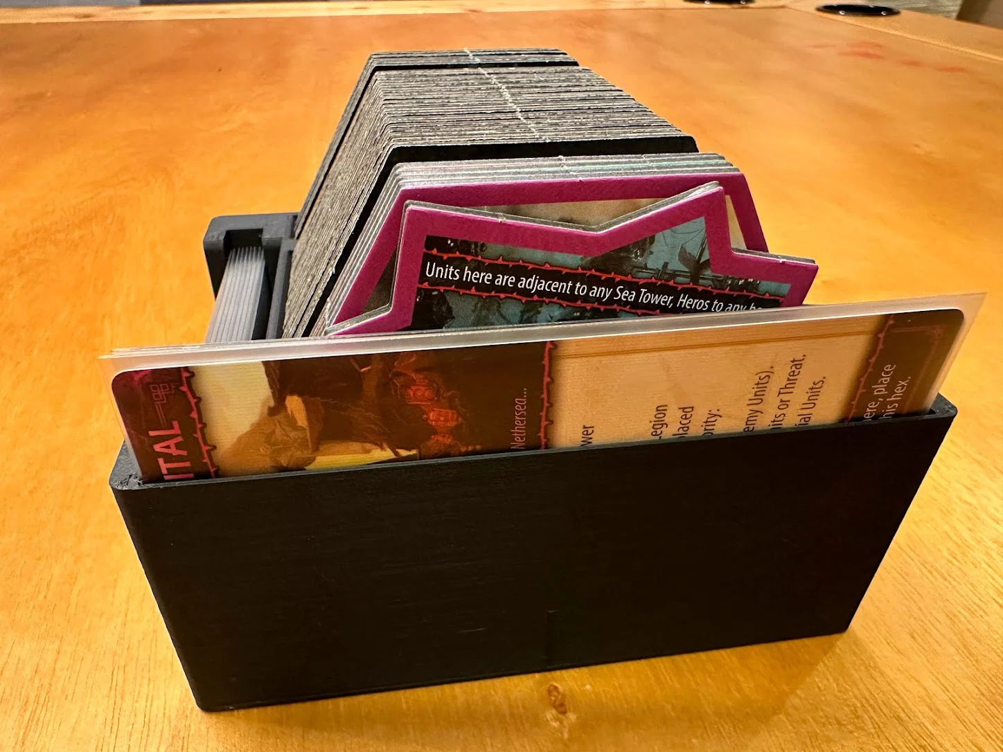 Tất cả thẻ trong hình đều đã bọc sleeve GameGenic Prime Matte, nên các hộc thẻ (card wells) sẽ hỗ trợ sleeve với mọi độ dày.
