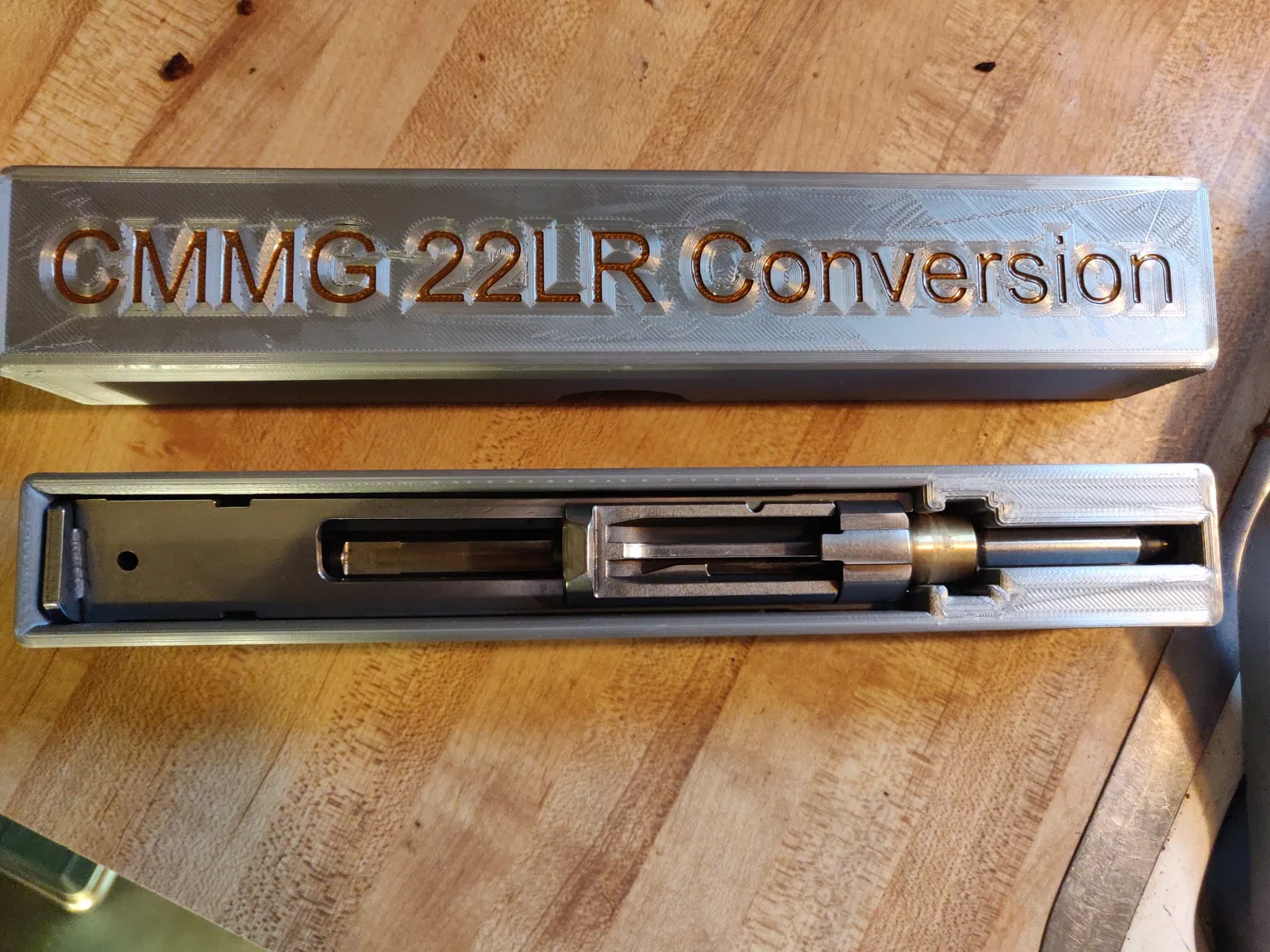 Đây là một hộp sẽ chứa bu lông chuyển đổi CMMG 22LR cho AR-15. Nó cũng có thể hoạt động như một hộp cho nhóm bu lông thông thường. Bu lông gần như vừa vặn hoàn hảo và rất ít chỗ trống. Nếu bạn muốn có nhiều khoảng trống hơn cho bu lông, bạn có thể phóng to nó lên 1-2% nhưng bạn cũng phải làm điều này với nắp hộp nếu không chúng sẽ không vừa. Bạn có tùy chọn in nắp với hoặc không có văn bản.