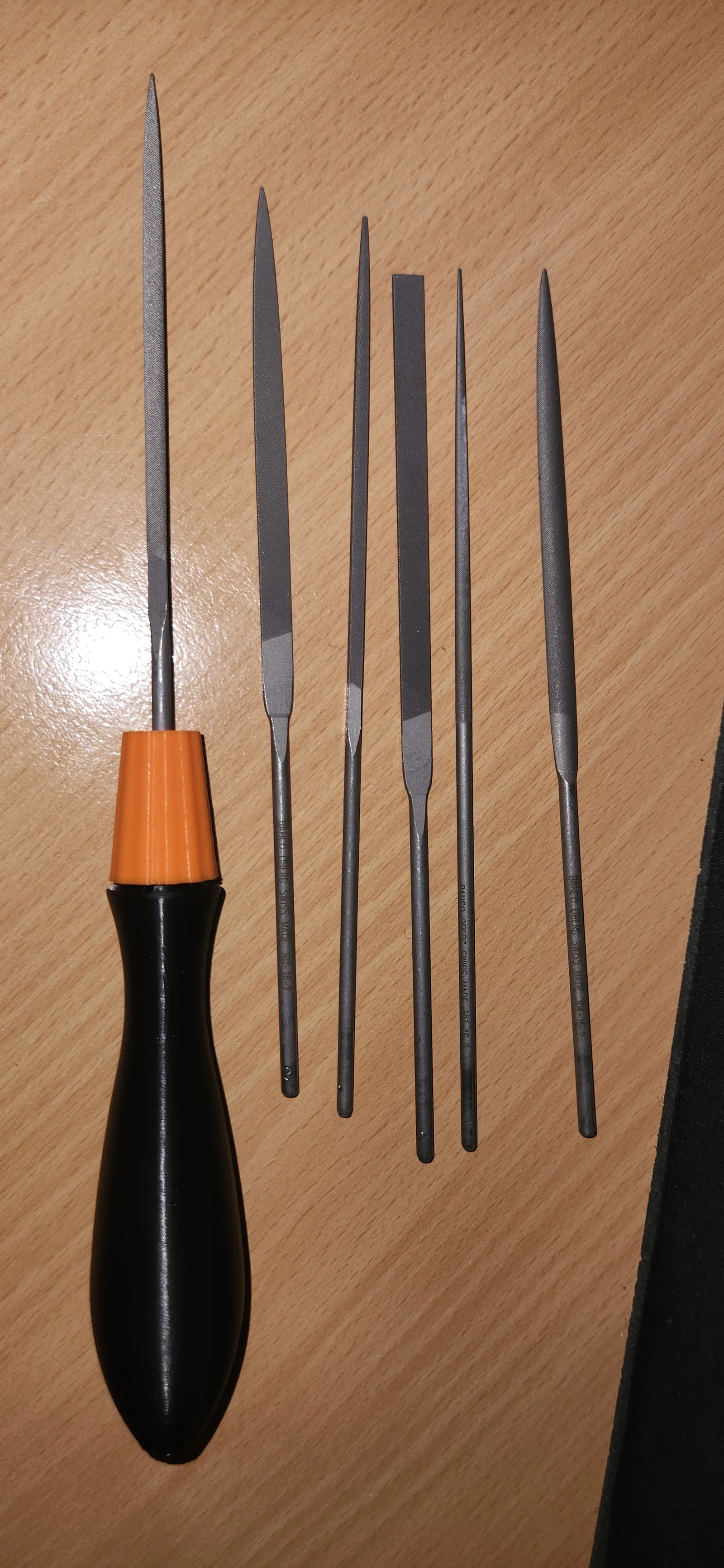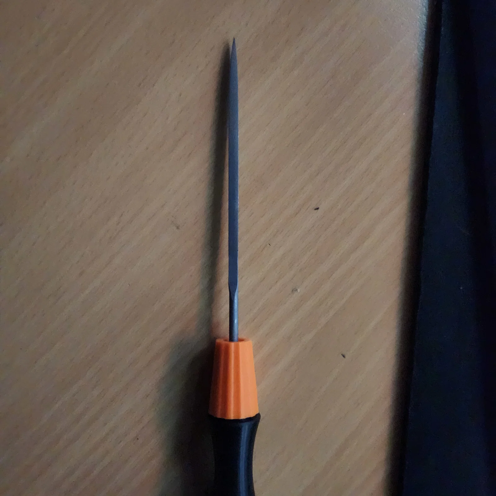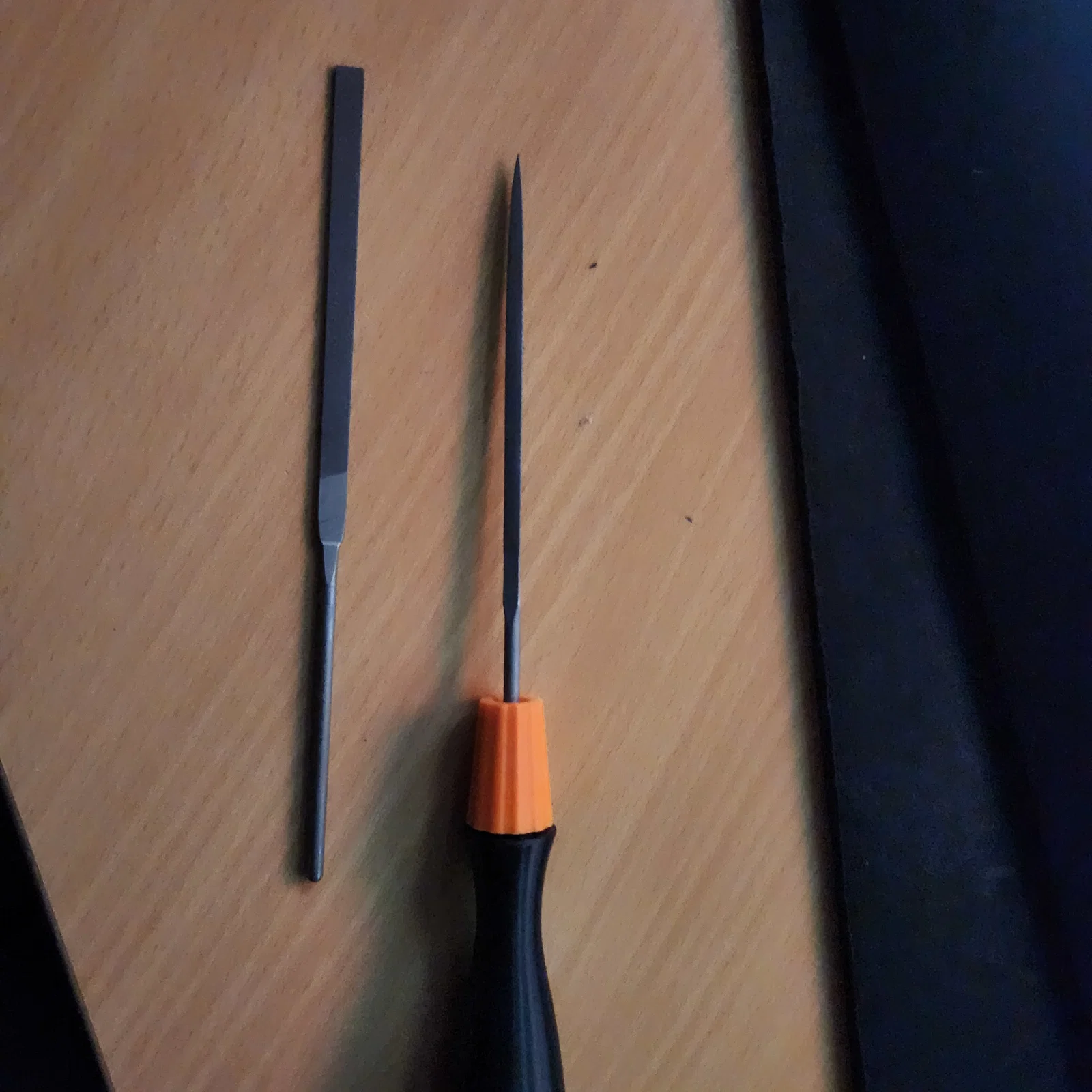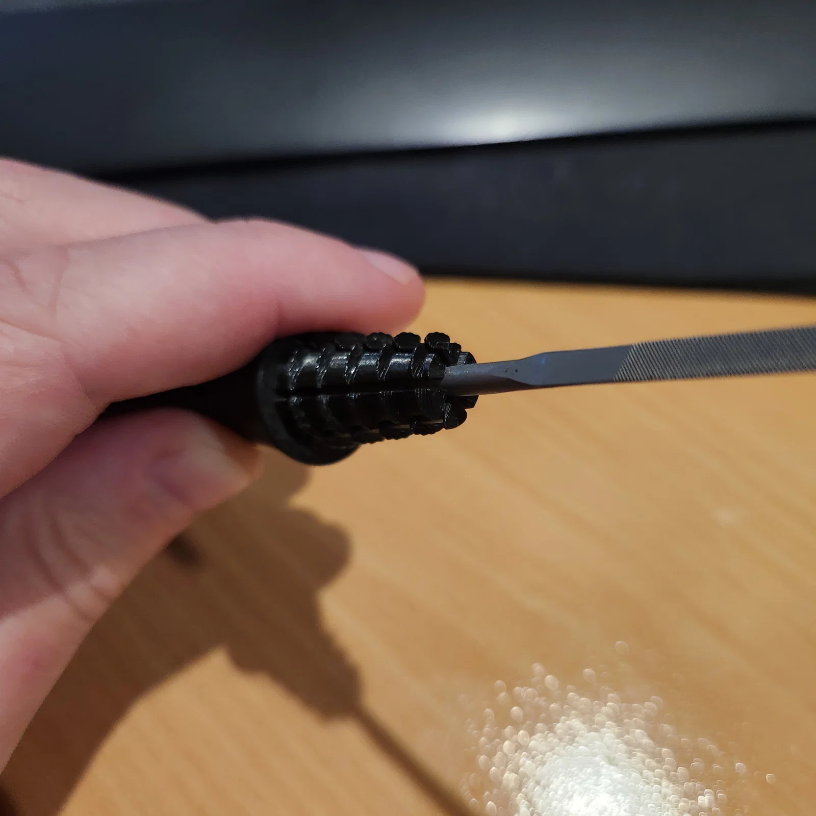 Tay cầm 2 mảnh kiểu ergonomic cho needle file, dùng nắp vặn có vít để thay file nhanh và siết giữ chắc. Có nhiều size 2–5mm, STL đã chừa tolerance; test với Bacho 3.0/3.25mm, hỗ trợ cán dài tới 110mm.