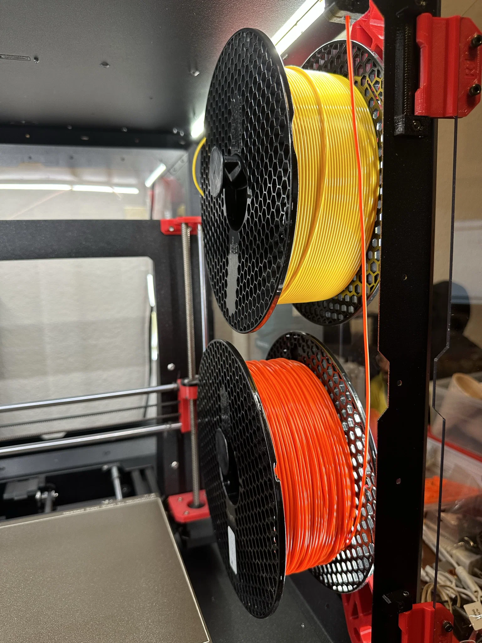 Mod thêm giá đỡ cuộn filament thứ hai cho Prusa Enclosure, đặt dưới giá đỡ mặc định và được kéo dài để dễ thay cuộn, không vướng bed. Có thể cấp filament từ cuộn trên hoặc cuộn dưới, tiện đổi màu.