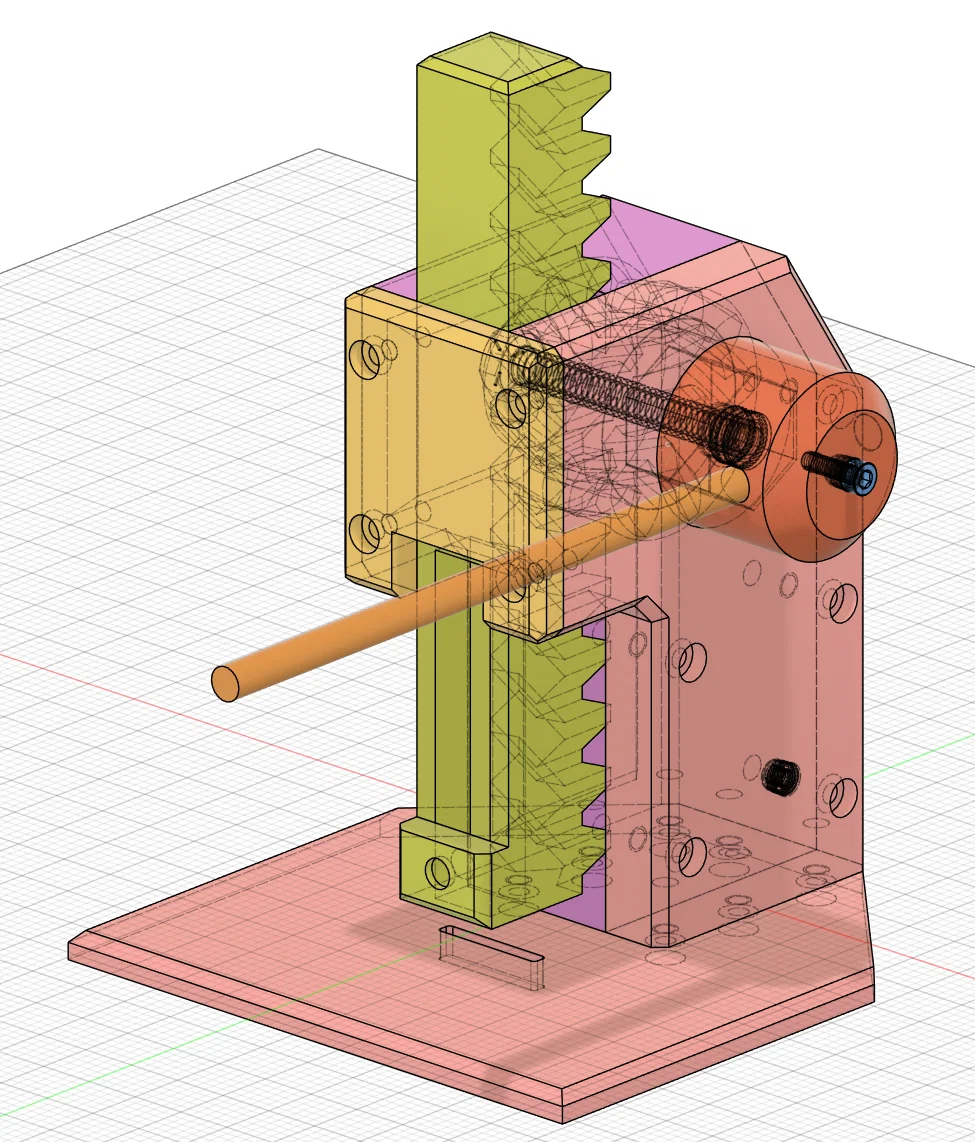 Thiết kế này đặc biệt hữu ích cho những ai cần sự ổn định khi đục lỗ khâu da, đảm bảo các lỗ đục thẳng hàng và đồng đều mà không làm hỏng bề mặt da do lực tác động không đều. Cơ chế bánh răng và thanh răng (rack and pinion) được thiết kế chắc chắn, giúp truyền lực từ tay cầm xuống mũi dập một cách hiệu quả. Điểm cộng lớn của phiên bản này là tác giả đã đính kèm sẵn tệp Fusion360, cho phép bạn dễ dàng tùy chỉnh kích thước hoặc thay đổi các chi tiết nhỏ để phù hợp với nhu cầu riêng của bản thân.